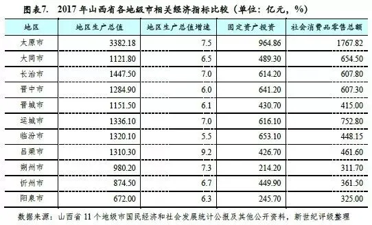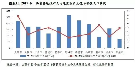 吕梁市地处吕梁山脉中段,是革命老区,亦是贫困地区,煤铁铝矿产资源和旅游资源丰富。2017年吕梁市实施产业发展战略,煤炭、冶金、焦炭等行业增加值快速增长,地区生产总值实现1310.3亿元,在山西省GDP排名由2016年的第8位升至第5位,同比增速为9.2%,增速排名从上年全省第6位上升到第1。朔州市历史悠久,煤炭储量丰富,主要是煤电工业,2017年地区生产总值980.20亿元,同比增长7.3%。忻州市是革命老区,欠发达地区,但矿产储量尚可,旅游资源较丰富。2017年忻州市实现地区生产总值874.50亿元,同比增长6.7%。阳泉市是三晋门户,晋冀要衡,地处太原、石家庄两个省会城市的中间位置,煤炭、铝矾土储量丰富,煤炭行业、电力行业、铝产业和耐火材料制造成为其支柱产业。2017年阳泉市实现地区生产总值672.0亿元,同比增速为6.3%。总体而言,山西省下属11个地市中太原市综合实力较强,占全省国内生产总值的20%,其余各地市经济发展水平不高。2017年受益于煤炭相关及制造业景气度提高,山西省大部分地区经济提速发展,但逾半数城市经济速度仍低于全国平均水平。