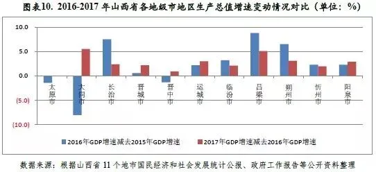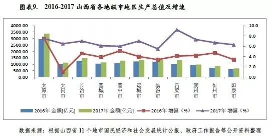 依托煤炭相关行业景气度提振以及推进产业结构转型升级,2017年山西省下属各地级市GDP均呈现正增长态势,其中除了太原GDP增速和上年持平之外,剩余10个地级市GDP增速均高于上年。