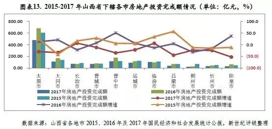 从山西省下辖各市房地产投资完成额规模来看,太原市房地产投资完成额规模较大,2017年为478.14亿元,占全省房地产开发投资总额的41.00%。同期,晋中、大同和临汾次之,分别完成房地产开发投资116.0亿元、111.4亿元和103.1亿元。朔州市房地产开发投资连续三年下滑,2017年仅实现房地产开发投资21.50亿元,居山西省最后。从增速来看,2017年山西省整体房地产投资下行压力较大,2017除长治市和临汾市分别较上年增长5.8%和6.6%之外;大部分地区房地产投资完成额均大幅下滑,尤其是阳泉市和吕梁市下滑最快,降速分别为52.7%和45.0%,其余各地区房地产投资完成额同比下滑速度在10%-40%之间,且以20%-30%为主。