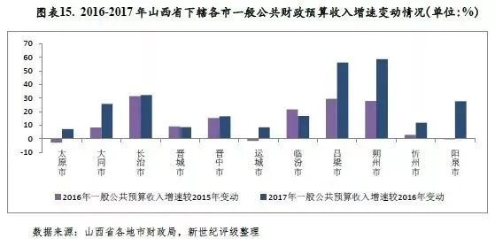 2017年山西省经济运行改善,企业经营效益提升,使得省内各地市一般公共预算收入大幅增加,增速相较于2016年大幅提高,6个地区增速由负增长转为正增长,且除忻州市外,各地区增速均超过全国一般公共预算收入增速。