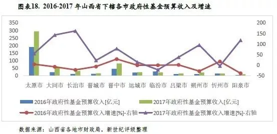 截至目前,山西省下属各地级市仅有朔州市公布2018年前三季度政府性基金完成情况,当期朔州市政府性基金收入完成12.81亿元,为预算的79.27%,同比增长47.85%;仅有太原市、忻州市和吕梁市披露了2018年上半年度政府性基金收入,其中太原市政府性基金收入完成67.42亿元,为预算的18.7%,下降21.6%;忻州市政府性基金收入完成10.7亿元,进度70.45%,同比增长76.52%;吕梁市政府性基金收入完成4.53亿元,为预算的18.95%,下降41.46%。此外,山西省自然资源厅公告的2018年土地出让结果数量明显少于2017年(主要是太原市土地成交减少;作为山西省政府性基金重要构成部分,太原市政府性基金收入减少或将影响全省情况)。山西省各地市中仅朔州市和长治市将2018年政府性基金分别较上年执行数调低39.94%和17.28%,其余各地市均调高10%-200%不等,预计实际完成难度偏大。