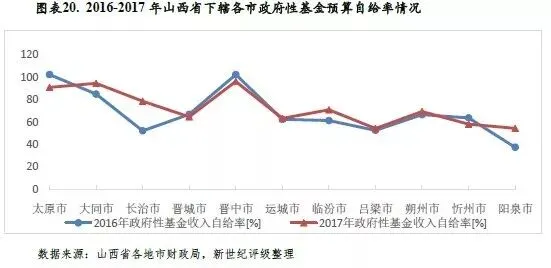 从政府性基金预算自给率情况看,山西省下辖各地市政府性基金预算收入对其支出的覆盖程度差距较大。晋中市和大同市政府性基金预算自给水平相对较高,2017年政府性基金预算自给率分别96.39%和94.69%;太原市居第三,为91.11%;吕梁市和阳泉市政府性基金预算收入对其支出的覆盖程度相对欠佳,2017年政府性基金预算自给率分别为54.29%和54.45%;其余各市2017年政府性基金预算自给率集中在60%左右。