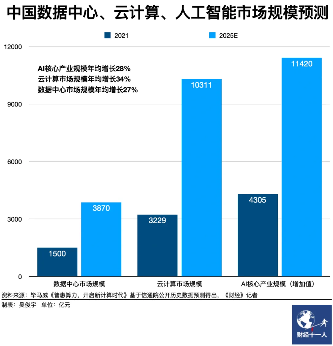 这一轮算力风口来得凶猛。毕马威今年7月发布的报告显示,未来数年中国算力相关产业将增长迅速。2025年中国算力关联产业规模将达24万亿元,算力核心产业规模超过4.4万亿元,人工智能、云计算、数据中心三大算力细分市场大于2.5 万亿元,AI核心产业规模年均增长将达28%,云计算市场规模年均增长将达34%,数据中心市场规模年均增长将达27%。