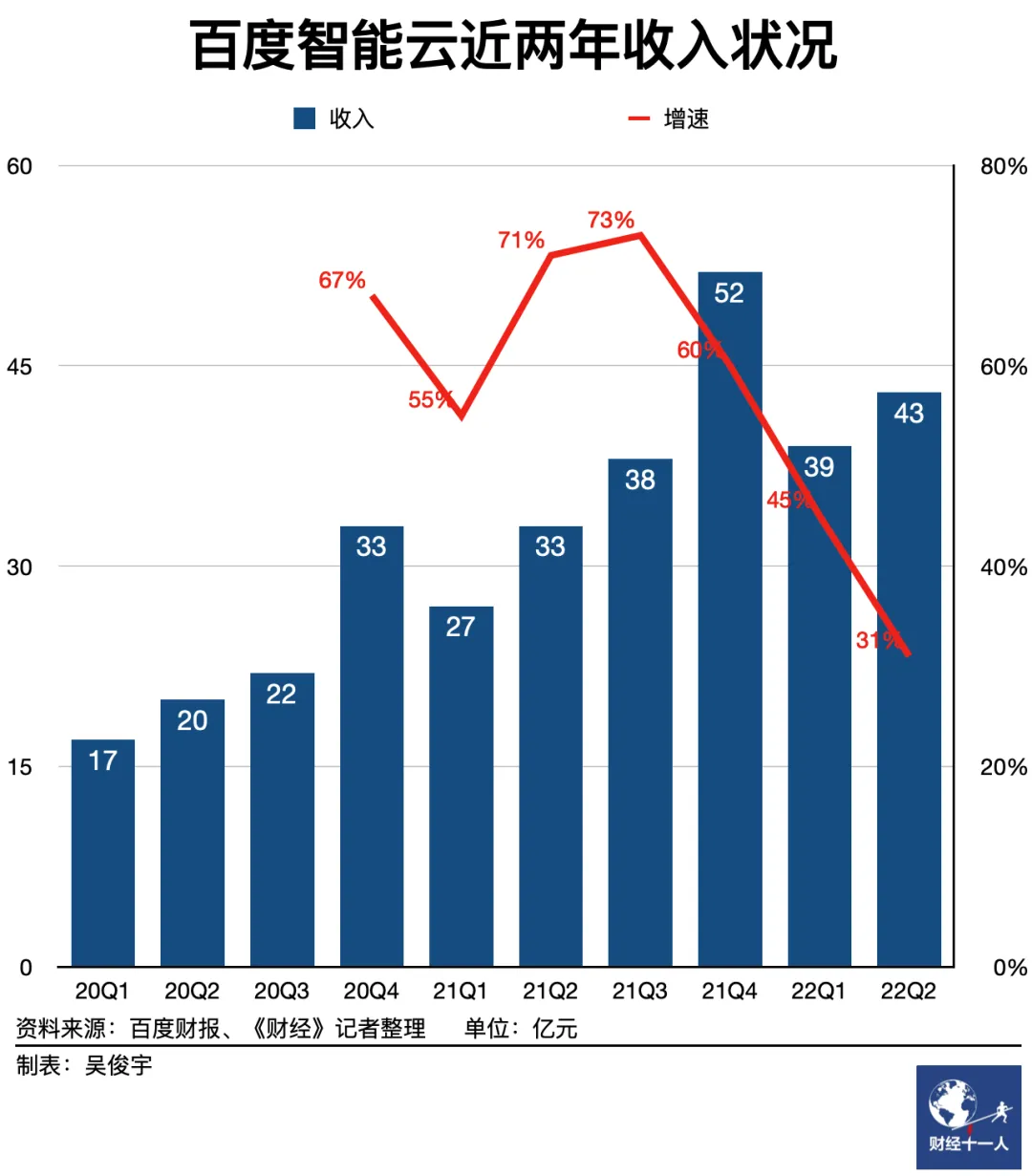 与之相反,运营商云份额在扩张,并成为更多政府数字化项目的总包商。《财经》记者查阅启信宝“全国招投标信息”系统发现,中国电信、中国移动、中国联通近一年超过1亿元的政府数字化大单签约数是三大头部云厂商的10倍以上(注:不完全统计,大量政府采购项目未公示,因此统计只包含已公开部分)。需求方的变化是,花钱更谨慎了,希望能精确计算投入产出比。一些行业(工业、制造等领域)本身利润率不高,预算有限。需求方希望通过数字化增效降本。然而通用工具太多,行业方案不足,懂行的服务商太少。需求方对云厂商的质疑声音正在变多。供需调整,云市场更难做了。第三方市场调研机构Canalys统计数据显示,2022年一季度百度在中国云市场份额为8.4%。面对市场剧变时,百度智能云收入增速比其他互联网云厂商更快,利润率也在持续改善。今年上半年疫情反复影响,百度智能云收入82亿元,仍同比增长36.7%。云业务在百度核心(剔除爱奇艺后的其他业务,包括广告、智能云、智能汽车、小度音箱)中的占比为18.6%,云业务在百度营收中的占比在持续上升。