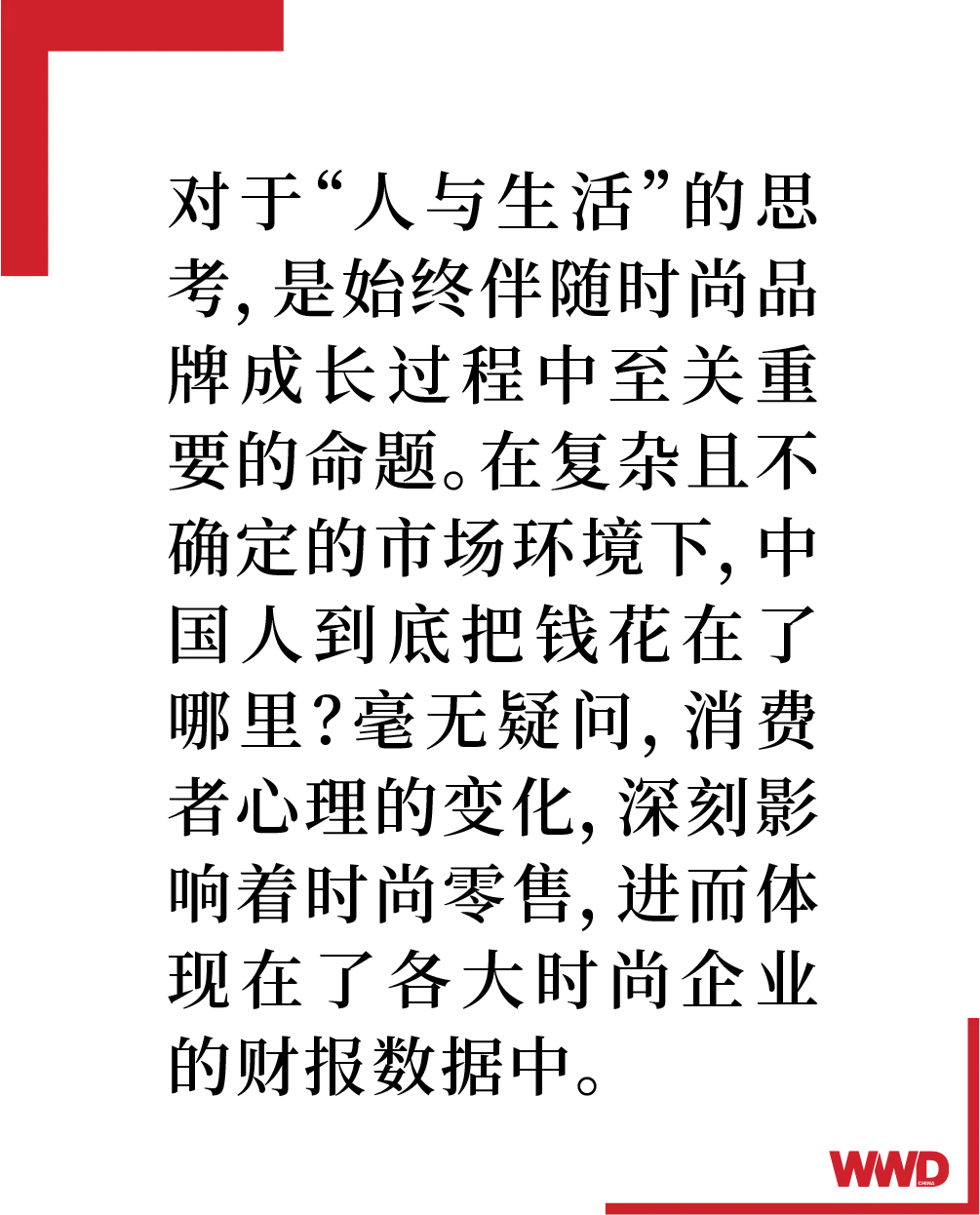 对于“人与生活”的思考,是始终伴随时尚品牌成长过程中至关重要的命题。在复杂且不确定的市场环境下,中国人到底把钱花在了哪里?毫无疑问,消费者心理的变化,深刻影响着时尚零售,进而体现在了各大时尚企业的财报数据中。