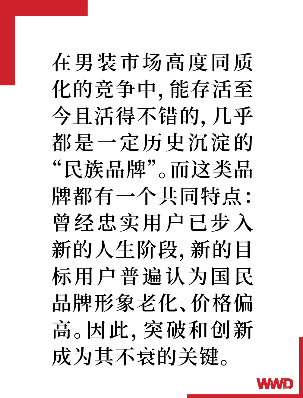 由此可见,转型和升级,可能是七匹狼制胜的关键词之一。在男装市场高度同质化的竞争中,能存活至今且活得不错的,几乎都是一定历史沉淀的“民族品牌”。而这类品牌都有一个共同的特点:曾经忠实的用户已步入新的人生阶段,新的目标用户普遍认为国民品牌形象老化、价格偏高。因此,突破和创新成为其不衰的关键。