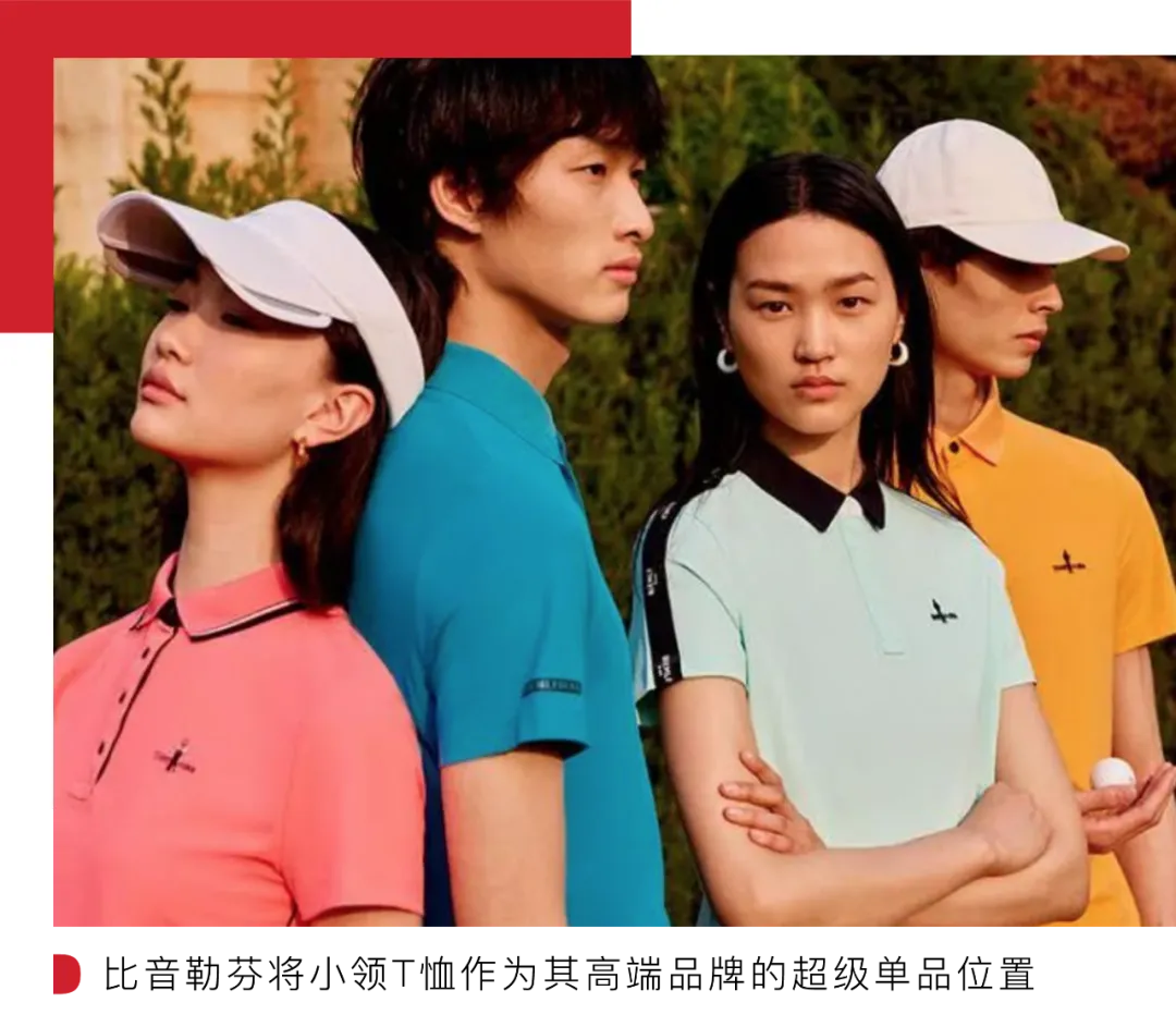 当市场开始回暖,竞争也愈加趋于白热化阶段。行业头部取得消费市场认可的背后,除了高端化,就是专业细分。在七匹狼和劲霸逐鹿高端男装夹克/茄克的时候,比音勒芬T恤连续五年(2018-2022 年)取得同类产品综合占有率第一,小领T恤正成为该品牌的“超级单品”,就如 lululemon 瑜伽裤、始祖鸟冲锋衣级别一样,比音勒芬小领T恤成为同品类中的权威产品。
