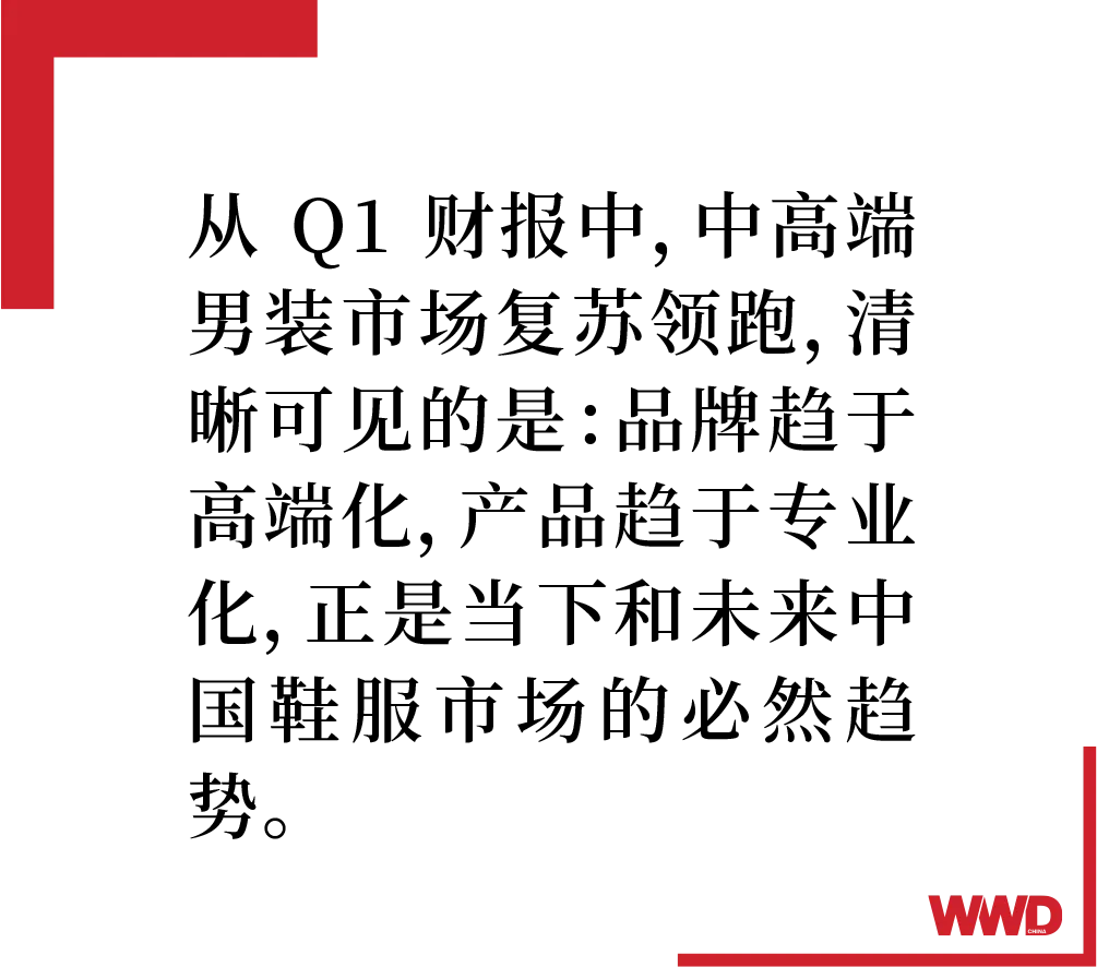 从 Q1 财报中,中高端男装市场复苏领跑,清晰可见的是:品牌趋于高端化,产品趋于专业化,正是当下和未来中国鞋服市场的必然趋势。