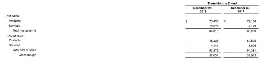 由此带来的一个明显变化是,苹果在净收入(Net sales)和销售成本(Cost of sales)的统计中,苹果开始分为产品(Products)和服务(Services)两项,将三大硬件和可穿戴设备等其他产品归入到产品类目中。