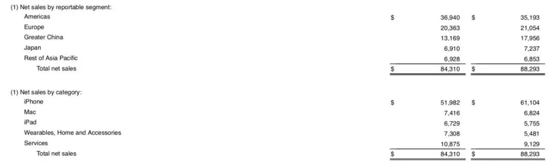 值得一提的是,在此前的临时报告中,对于各地区、各产品的营收,除了当期数据外,苹果还会给出去年同期和上个季度的数据,并展示出百分比的变化。本次的临时报告则要简单很多,仅给出了当期数据和去年同期数据。