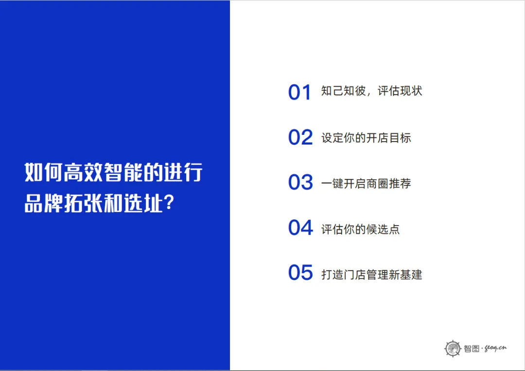 本次智图GeoQ发布《连锁品牌战略规划与选址开发白皮书》,正是基于当下市场窗口期,结合零售餐饮品牌选址拓店业务流程,希望能通过增长策略和智能工具,从现状评估、设定目标、商圈推荐、评估候选点、新门店管理5个维度,助力连锁品牌高效“落子”,稳健向上。