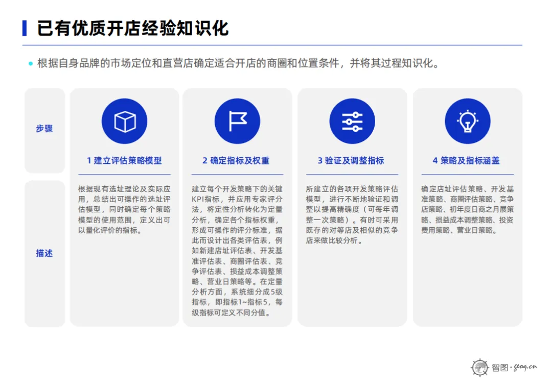 可从建立评估策略模型、确定指标及权重、验证及调整指标、策略及指标涵盖等四个方面将过往开店经验沉淀并进行知识化,从而为后续选址做准备。