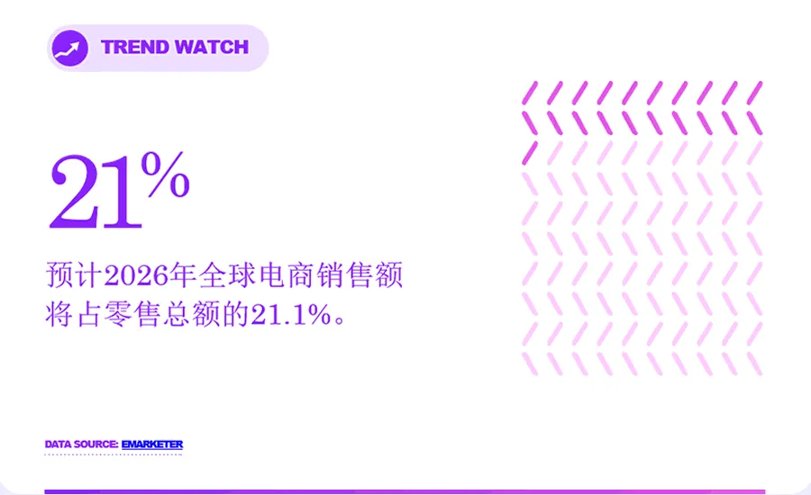 根据《2025 年全球零售电商预测》报告,2025 年电商增长出现下滑——eMarketer 将其归因于中国经济及贸易战对北美地区造成的压力——但预计 2026 年全球电商销售额将占零售总额的21.1%。eMarketer 同时预测,在连续数年下滑后,2026 年将实现 7.2% 的正增长率。结合全球零售电商销售额预计达 6.88 万亿美元的预测数据,这一市场在未来几年有望趋于稳定,前景更为乐观。