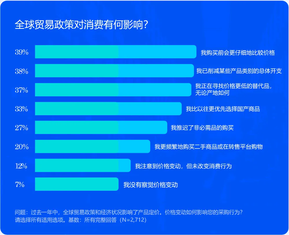 随着全球贸易政策频繁变动,消费者常面临价格上涨、选择减少、商品结构变化或三者兼具的局面。他们的应对策略包括不同程度地关注价格与商品原产地。消费者保持谨慎但不过度挑剔,更仔细地比较价格,在特定商品类别中削减开支,并寻求更低价的替代品——无论其原产国为何处。