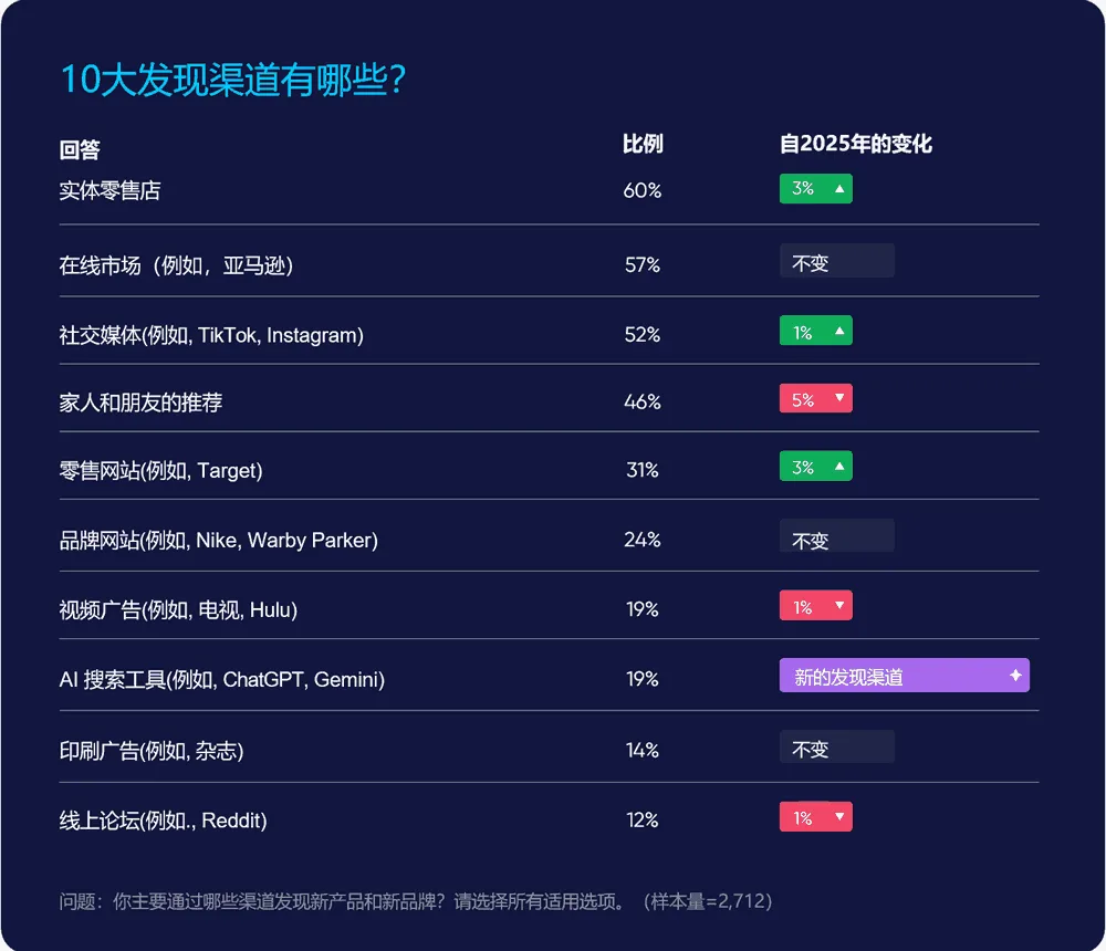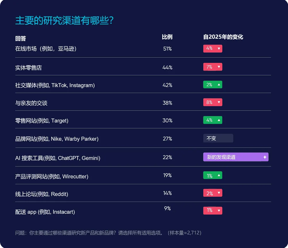 在研究新产品和品牌时,使用 AI 搜索工具的消费者比例(22%)已超过产品评论网站(19%)和 Reddit 等在线论坛(14%)。