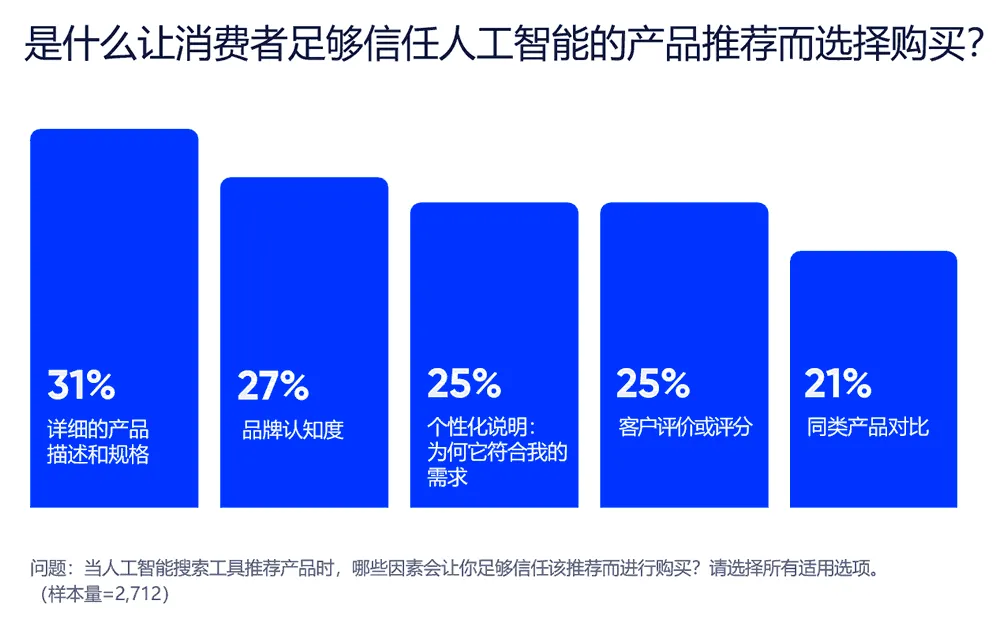 对品牌而言,值得投入 AI 推荐来赢得市场,但如果缺乏引人入胜的产品内容支撑,在 AI 信任缺口存在的情况下,这些推荐对消费者而言毫无价值。