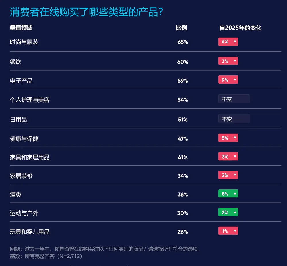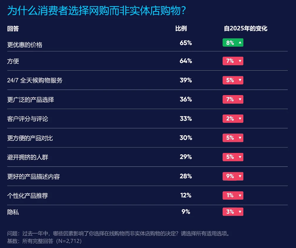 相较于 2025 年的调查,价格优势已超越便捷性成为首要因素,但这两大因素仍稳居前列。消费者同样持续享受线上购物全天候服务与更丰富的商品选择。