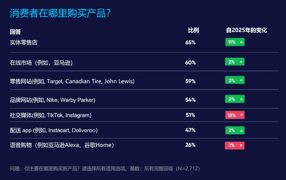 尽管预计 2026 年电商销售额将持续增长,但消费者网购频率却呈下降趋势——考虑到影响价格与产品供应的经济变动,这一现象并不令人意外。更出人意料的是,多数消费者发现新产品与新品牌的主要渠道是实体零售店。这一发现再次印证了品牌优化全渠道战略的必要性。