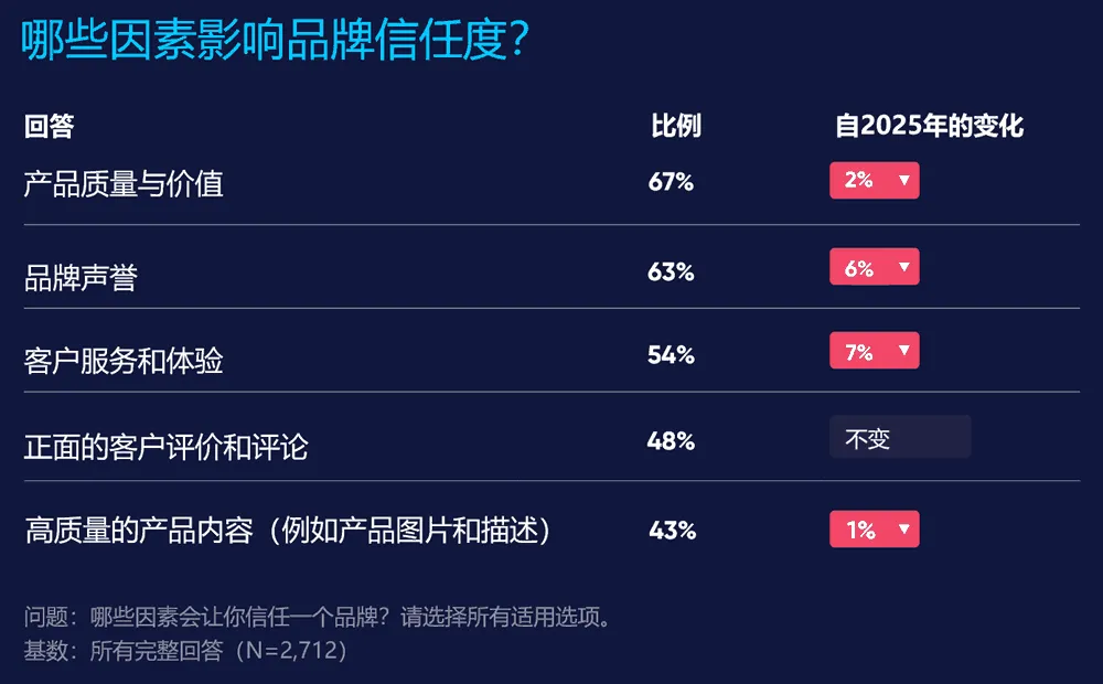 产品质量与价值再次成为影响品牌信任度的首要因素,品牌声誉紧随其后。当然,品牌声誉本身涵盖诸多要素,尤其是对于历史悠久的品牌而言。新兴品牌可通过强调客户服务与体验来建立声誉。