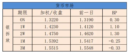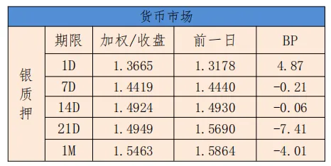 今日银行间市场主要回购利率整体下行。隔夜加权平均利率收盘于1.3665%,上日的收盘价为1.3178%,上行4.87BP;14天收盘价为1.4924%,相比较昨天的收盘价格1.4930%,下行0.06BP。