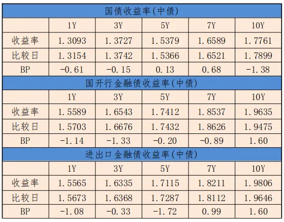国开债曲线今天收益整体下行,3年期带动曲线对应期限下行1.33BP,至1.6543%;5年期带动曲线对期限下行0.20BP,至1.7412%;10年期带动曲线对应期限上行1.60BP,至1.9635%。