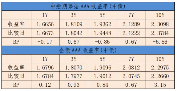 中债中短期票据收益率曲线(AAA)1年期收益率下行0.17BP,至1.6796%,3年期收益率上行0.67BP,至1.8109%。