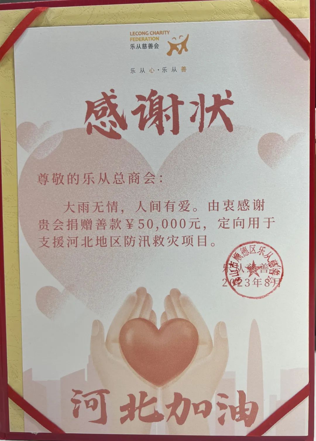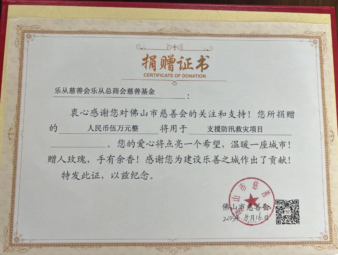 乐从慈善会发动镇内商协会等社会组织和热心企业参与,乐从慈善会乐从总商会慈善基金捐赠5万元,乐从慈善会乐从女企慈善基金捐赠5万元,美鸽天下“华康润”慈善基金、计通慈善基金各定向捐赠1万元。截至2023年8月11日17时,乐从慈善会筹集定向防汛救灾善款12万元,用慈心善举共同筑起爱的堤坝,共建美好家园。