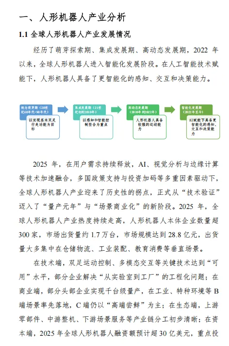 赛迪《2025 年人形机器人市场研究报告》核心结论:2025 年是人形机器人 “量产元年”,全球市场规模达 28.8 亿元,出货量 1.7 万台,中国以 84.7% 的出货量占比、53.8% 的市场规模占比领跑全球。产业呈现 “技术迭代 + 场景落地” 双轮驱动,工业制造率先规模化应用,商业服务加速渗透,中美形成差异化竞争格局,核心零部件国产化与成本下探成为行业增长关键。