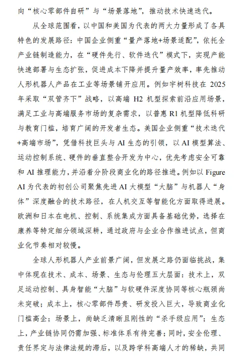 中国:侧重 “量产落地 + 场景适配”,依托完整供应链实现成本控制,工业场景率先突破。 北美:聚焦 “技术原创 + 高端市场”,AI 算法与运动控制领先,但量产效率与成本优势不足。 欧洲 / 日本:深耕细分场景(康养、精密制造),零部件技术扎实但商业化节奏较慢。