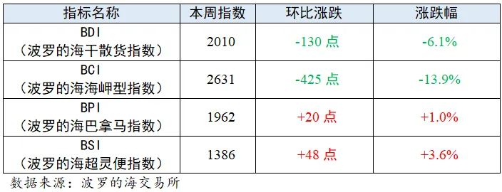 本周全球干散货船市场需求偏弱,波罗的海干散货运价震荡下跌,周五报收于2010点,较上期下跌6.1%。