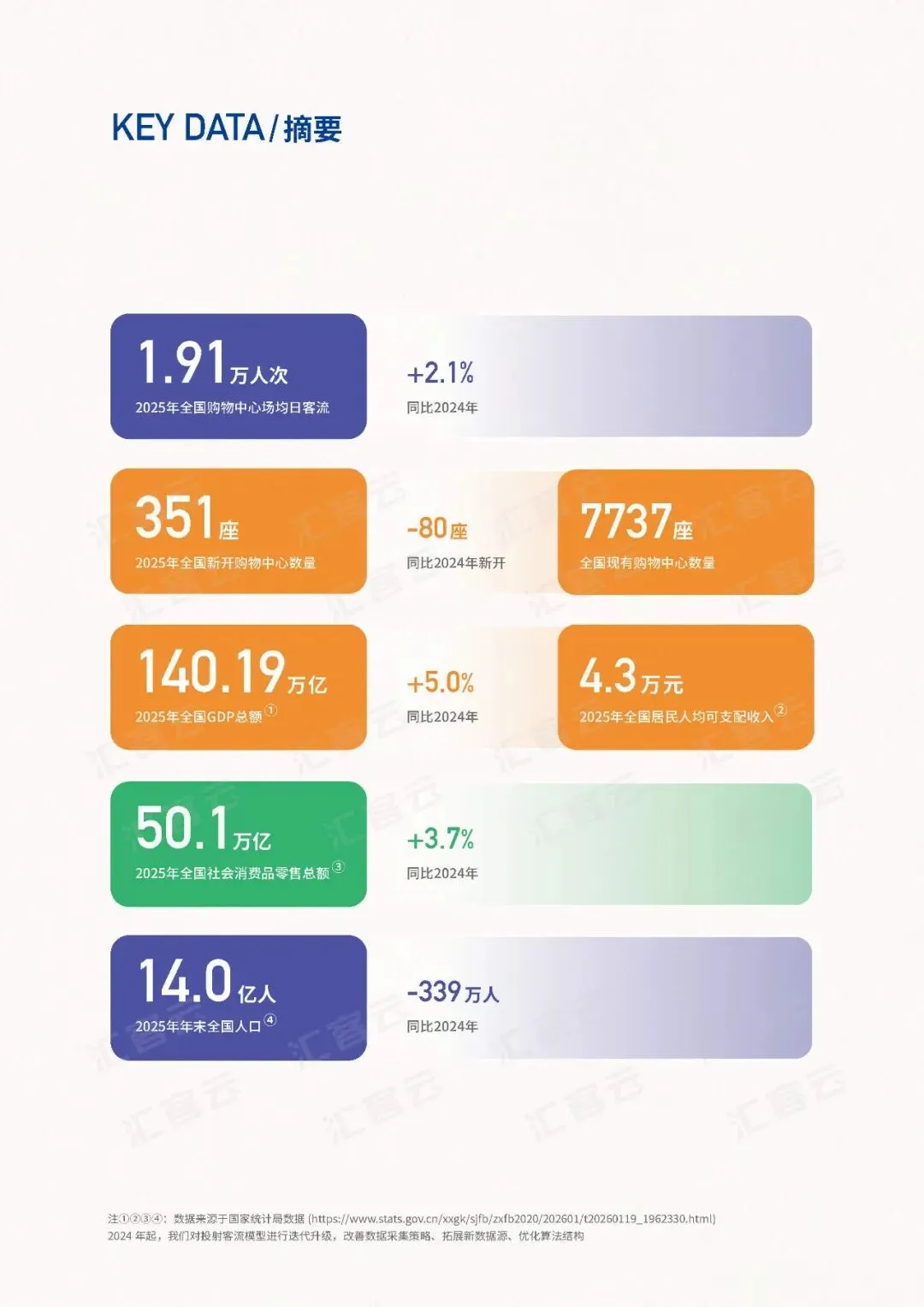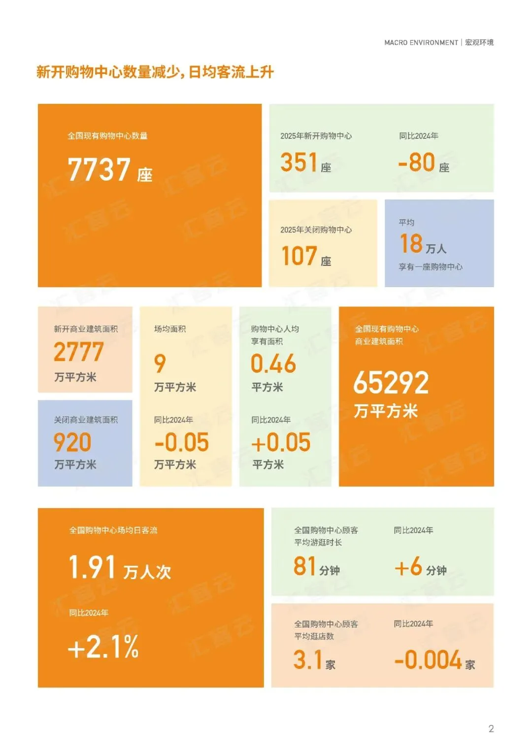商场的数量,不再是衡量商业活力的唯一标尺。2025 年全国新开购物中心 351 座,较 2024 年减少了 80 座,同期关闭的购物中心数量为 107 座。截至 2025 年末,全国现有购物中心总量达到 7737 座,对应的商业建筑面积 65292 万平方米,平均每 18 万人享有一座购物中心,人均享有购物中心面积 0.46 平方米。新开项目的场均面积为 9 万平方米,和 2024 年基本持平,行业早已告别了规模化扩张的野蛮生长,进入了存量深耕的新周期。