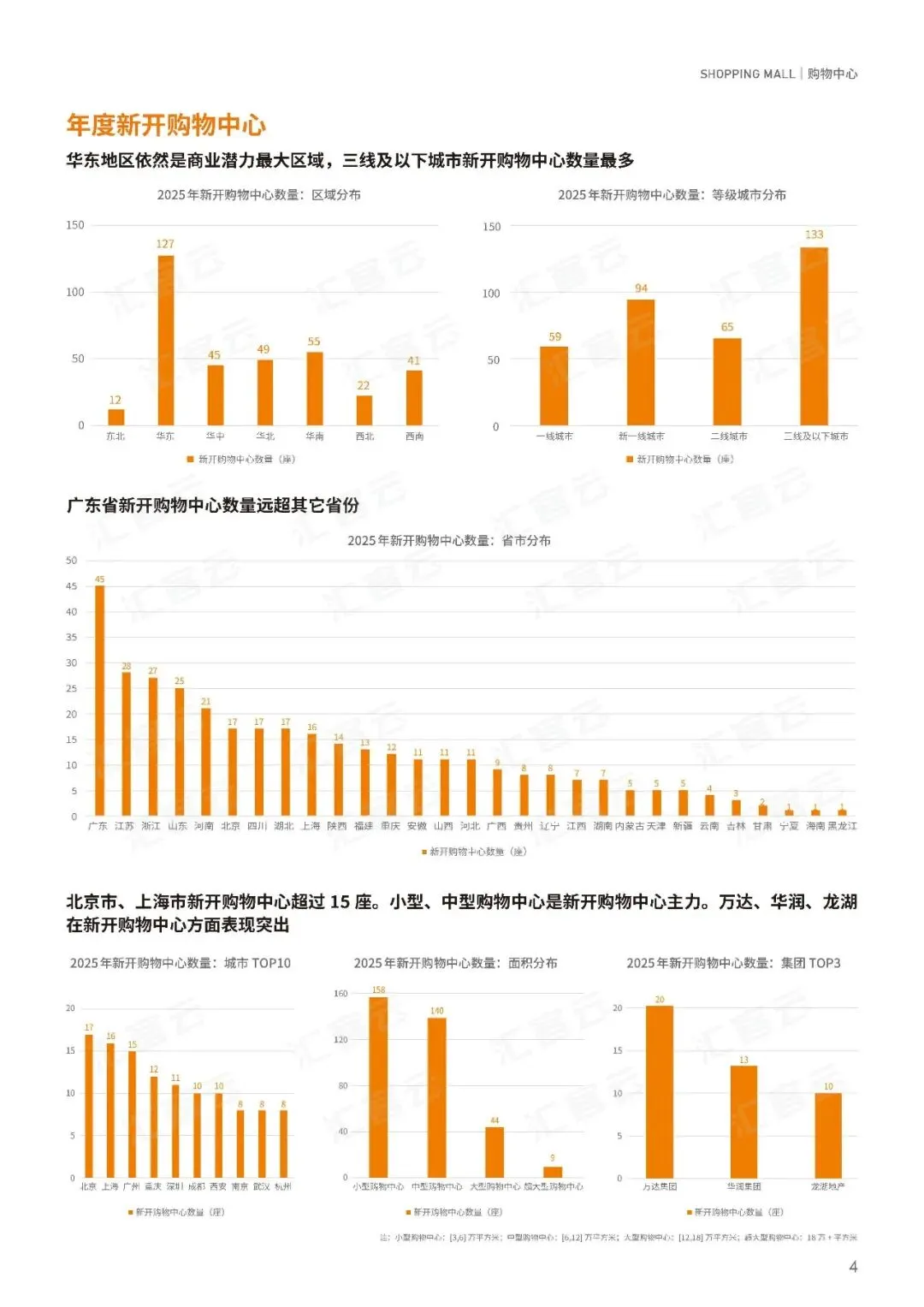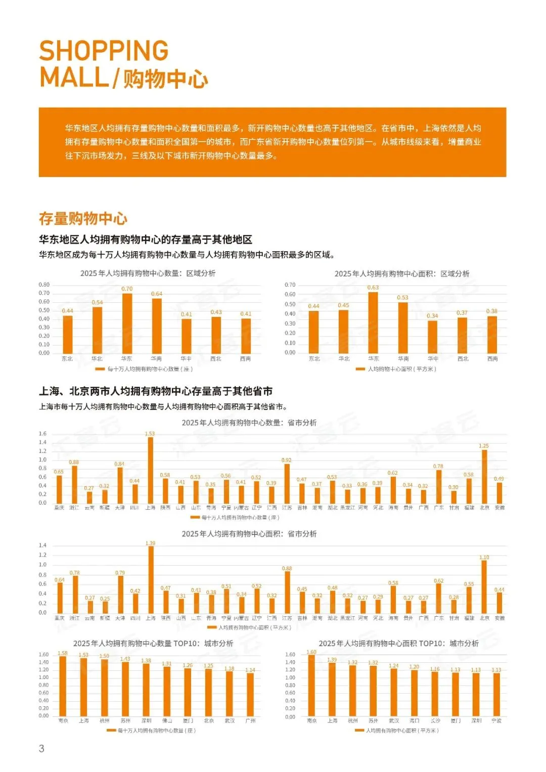 商业的版图,正在呈现更清晰的区域分化。华东地区依然是国内商业最活跃的区域,无论是人均拥有的购物中心存量,还是年度新开购物中心数量,都排在全国首位。广东省 2025 年新开购物中心数量远超其他省份。城市层面,上海依旧是全国人均拥有购物中心数量和面积最高的城市,然后是北京。而增量商业的重心,正在持续向下沉市场倾斜,2025 年三线及以下城市的新开购物中心数量,超过了一线、新一线和二线城市,县域商业的活力,正在被持续激活。