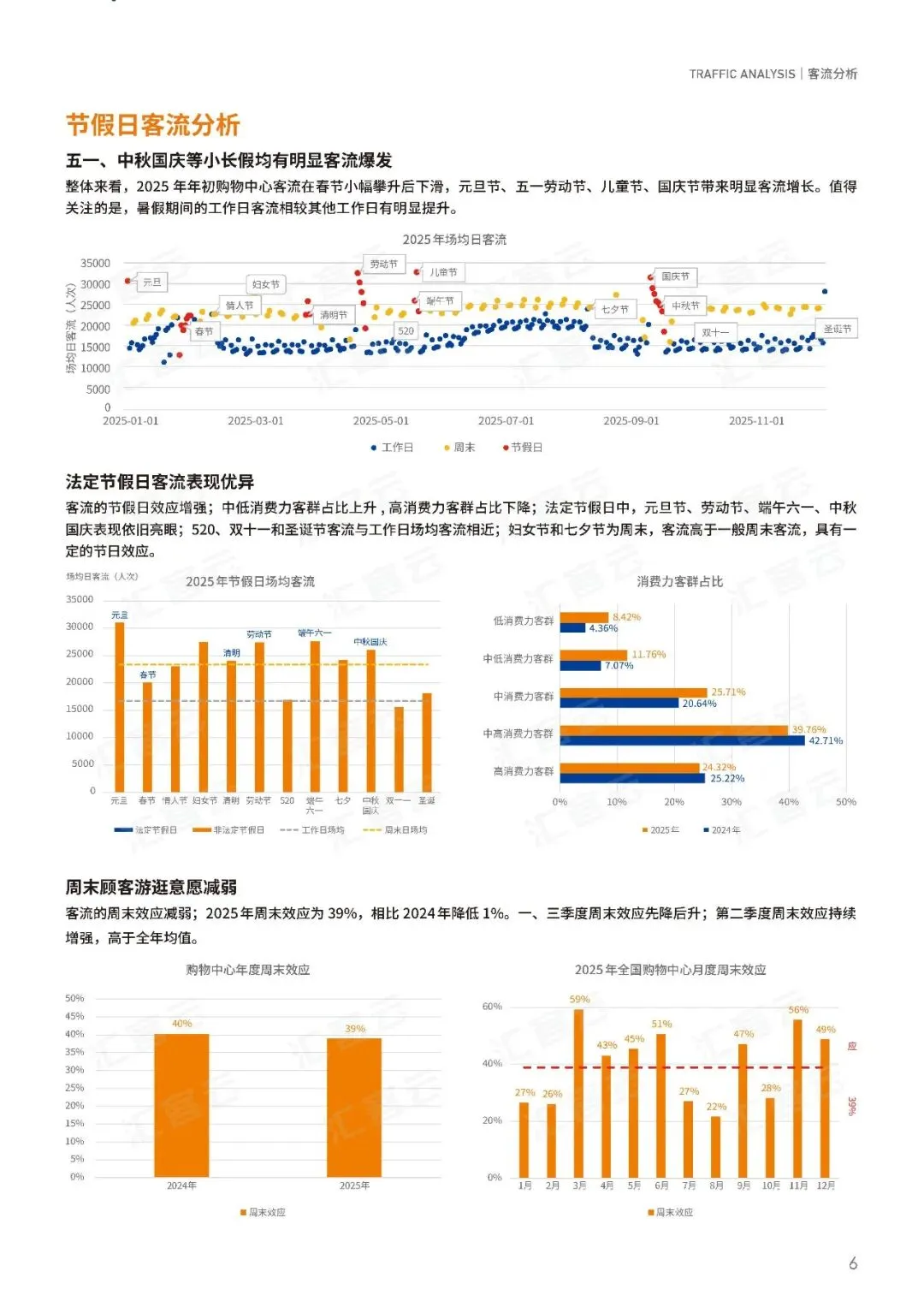 消费者对节日的选择,变得越来越务实,只有真正的假期,才能撬动他们走出家门的脚步。客流的周末效应正在减弱,2025 年全国购物中心周末效应为 39%,较 2024 年下降了 1 个百分点,消费者逛商场的时间,不再集中在周末两天,而是变得更加分散,日常逛商场,正在成为更多人的生活习惯。