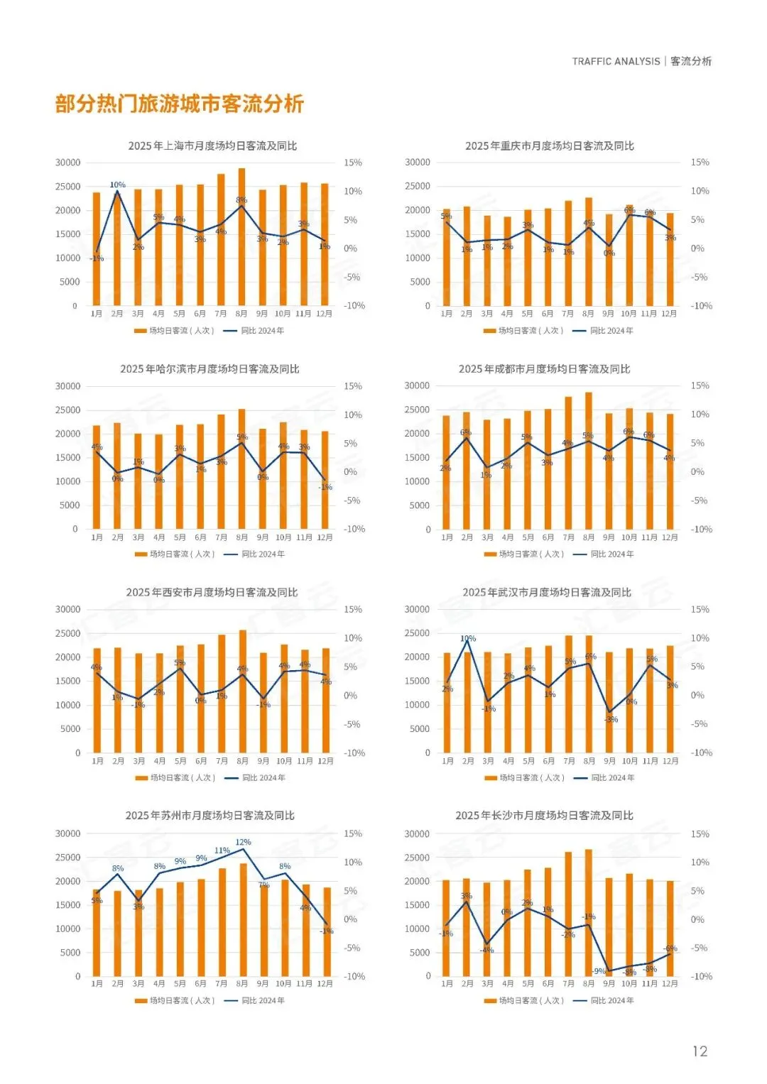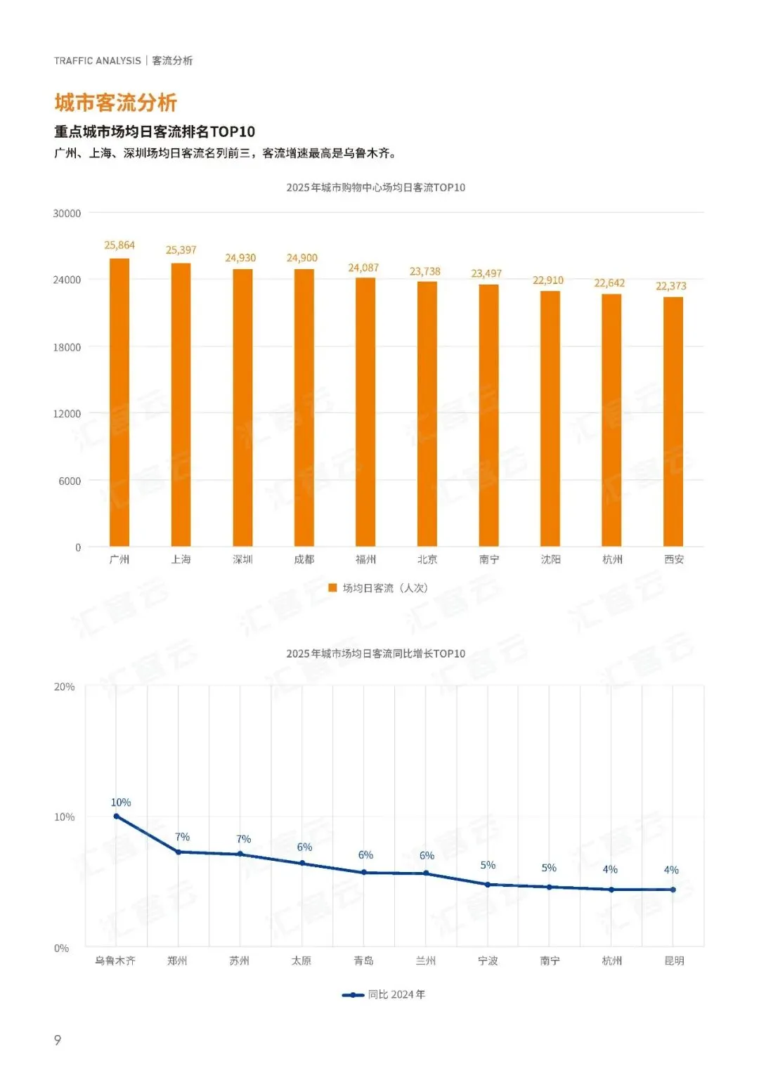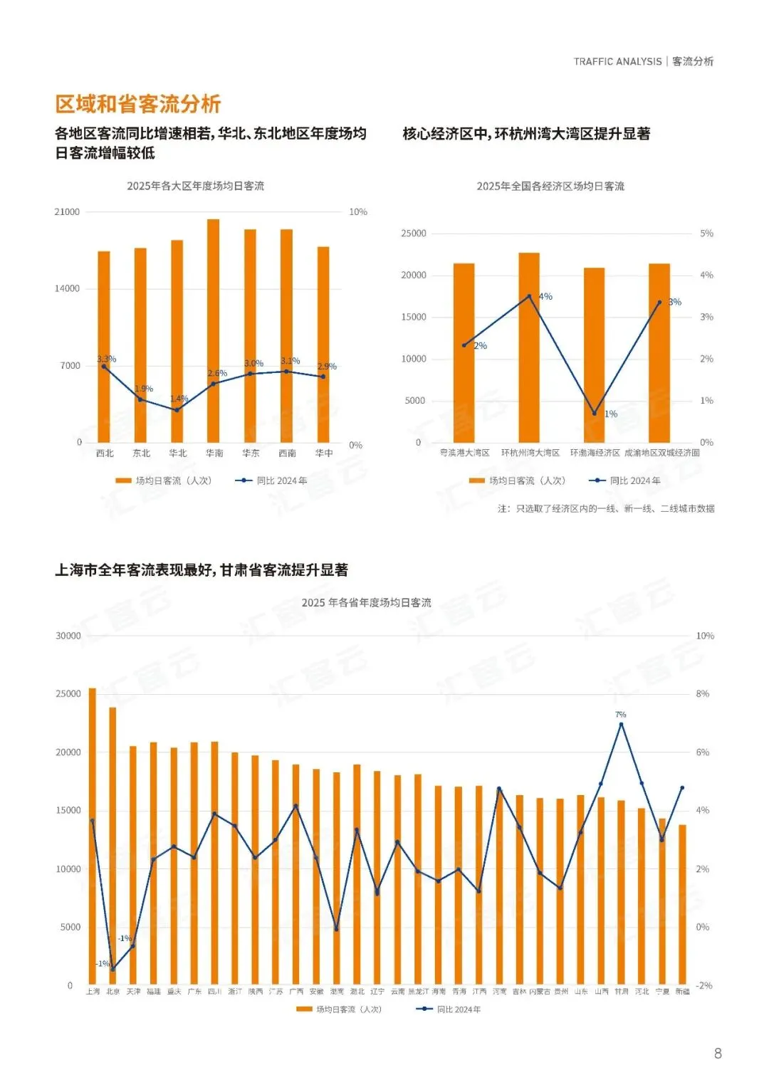 城市线级的差异更加明显,2025 年各线级城市的场均日客流均实现了同比上升,但一线城市的增幅最小,三线及以下城市的客流增长最为突出,下沉市场的消费潜力,正在转化为实实在在的客流增长。一线城市内部,上海的场均日客流同比增幅最大,新一线城市里,郑州和苏州的客流增长最为显著,二线城市中,南宁和福州的场均日客流,超过了同级别其他城市。