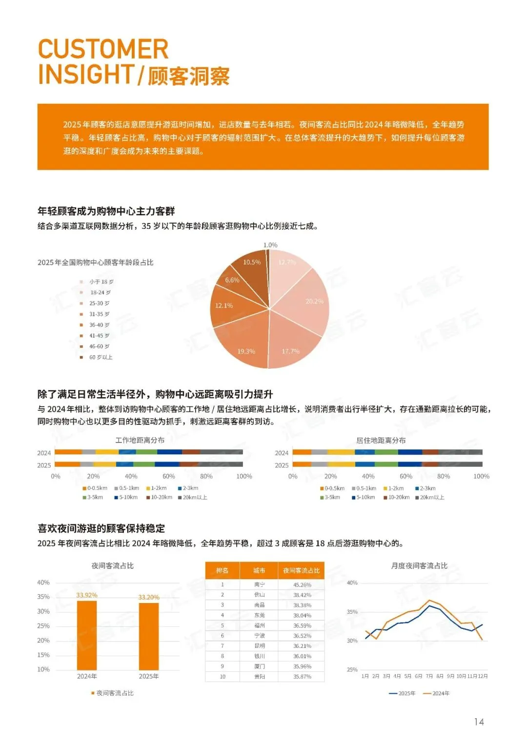 走进商场的人,正在改变逛商场的方式。2025 年,35 岁以下的年轻顾客,占购物中心总客流的比例接近七成,年轻人依然是实体商业的绝对主力客群。消费者的出行半径正在持续扩大,和 2024 年相比,到访购物中心的顾客里,工作地和居住地距离商场较远的人群占比持续增长,消费者不再只盯着家附近 3 公里内的商场,愿意为了更好的体验,奔赴更远的商业体,购物中心的辐射范围,正在被持续拓宽。