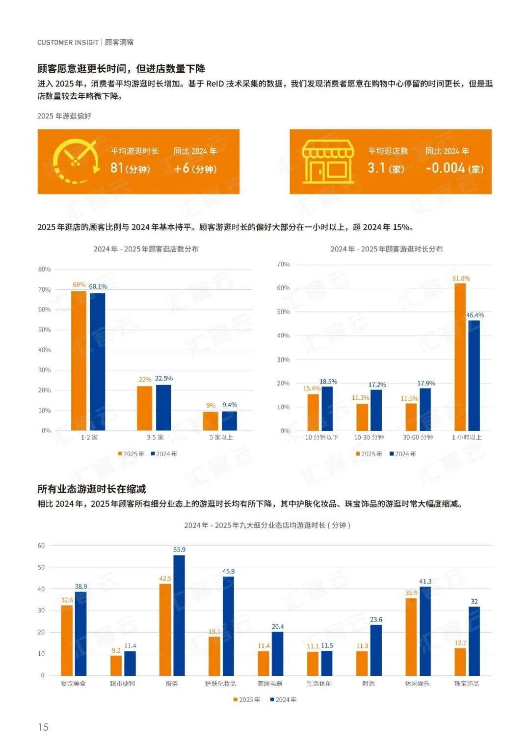 消费者在商场里的停留,正在变得更有深度。2025 年,全国购物中心顾客的平均游逛时长达到 81 分钟,较 2024 年增加了 6 分钟,而平均逛店数为 3.1 家,和 2024 年基本持平,仅有微幅下降。这意味着,消费者在商场里待的时间更长了,但逛的店铺数量却没有增加,大家不再是走马观花式的扫店打卡,而是愿意在自己感兴趣的空间里停留更长时间,沉浸式的体验,正在取代目的性的扫货,成为逛商场的核心意义。