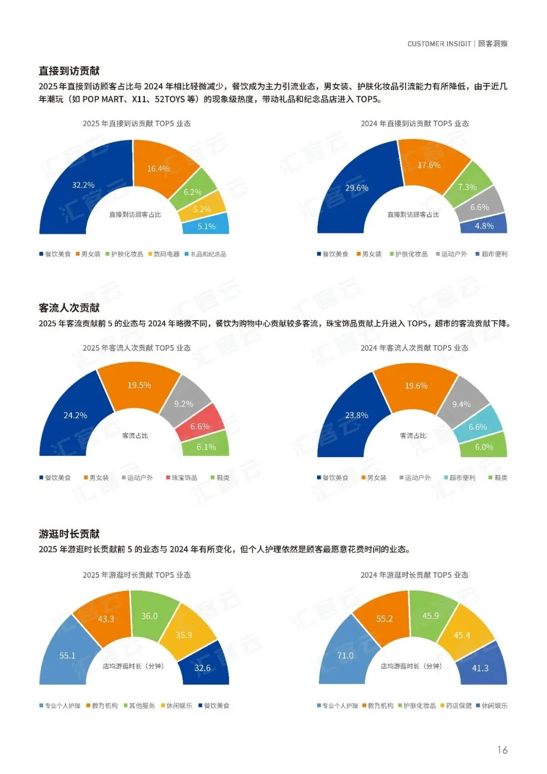 商场里的业态,正在重新排定引流的座次。2025 年,餐饮美食业态依旧是购物中心的第一引流主力,直接到访贡献占比达到 32.2%,较 2024 年还有所提升,是所有业态里唯一占比超过 30% 的存在。男女装和护肤化妆品的引流能力持续下降,而礼品和纪念品店,凭借潮玩品类的热度,首次进入直接到访贡献 TOP5 的行列。
