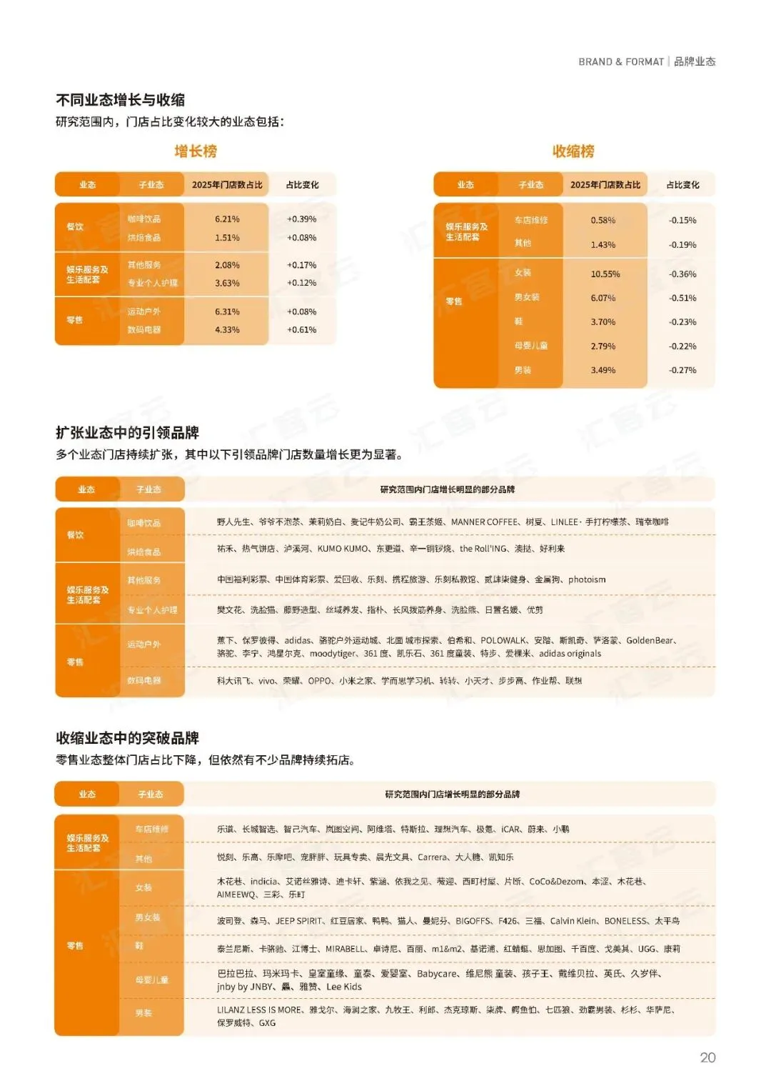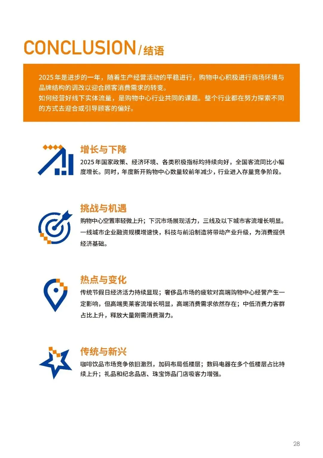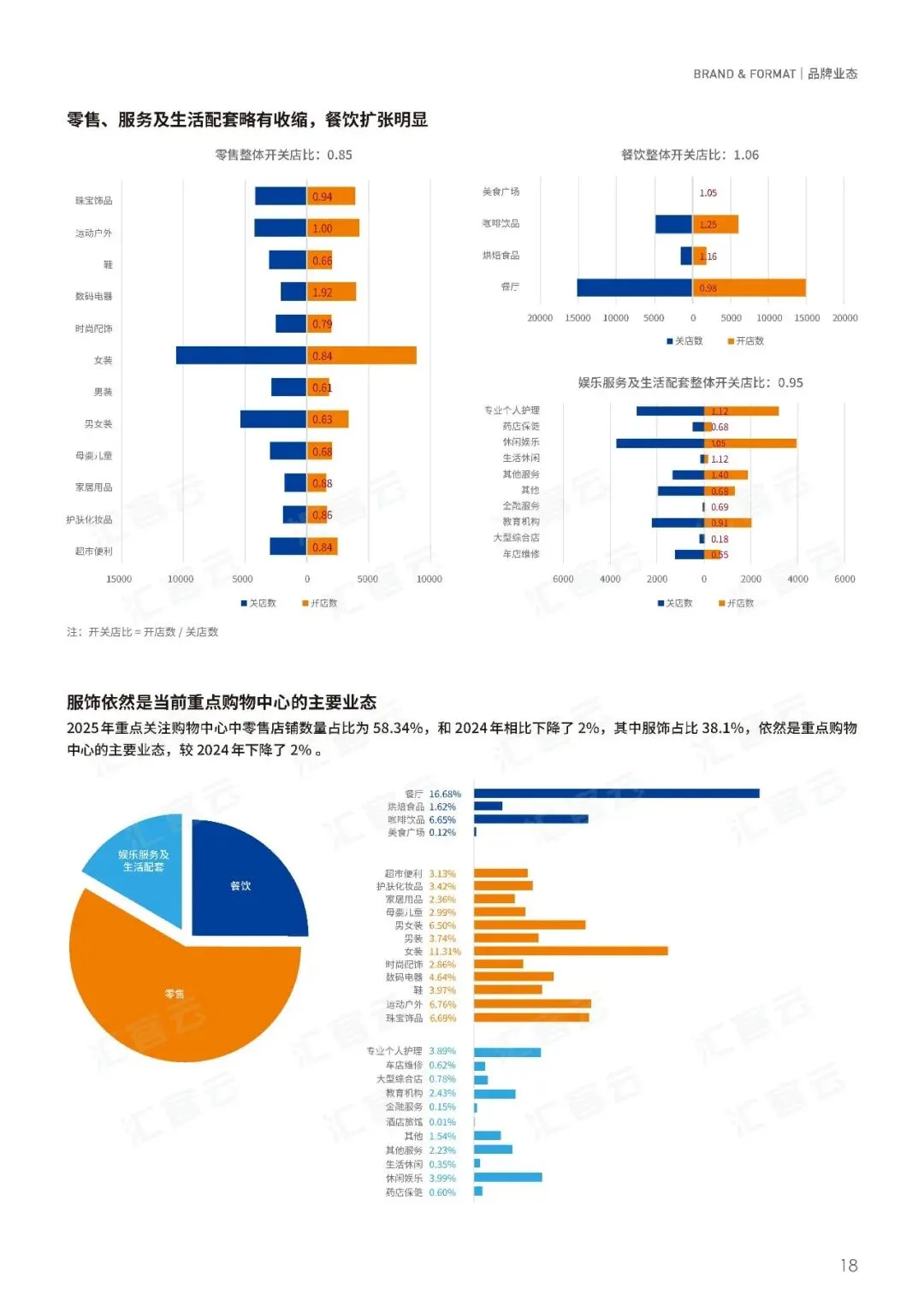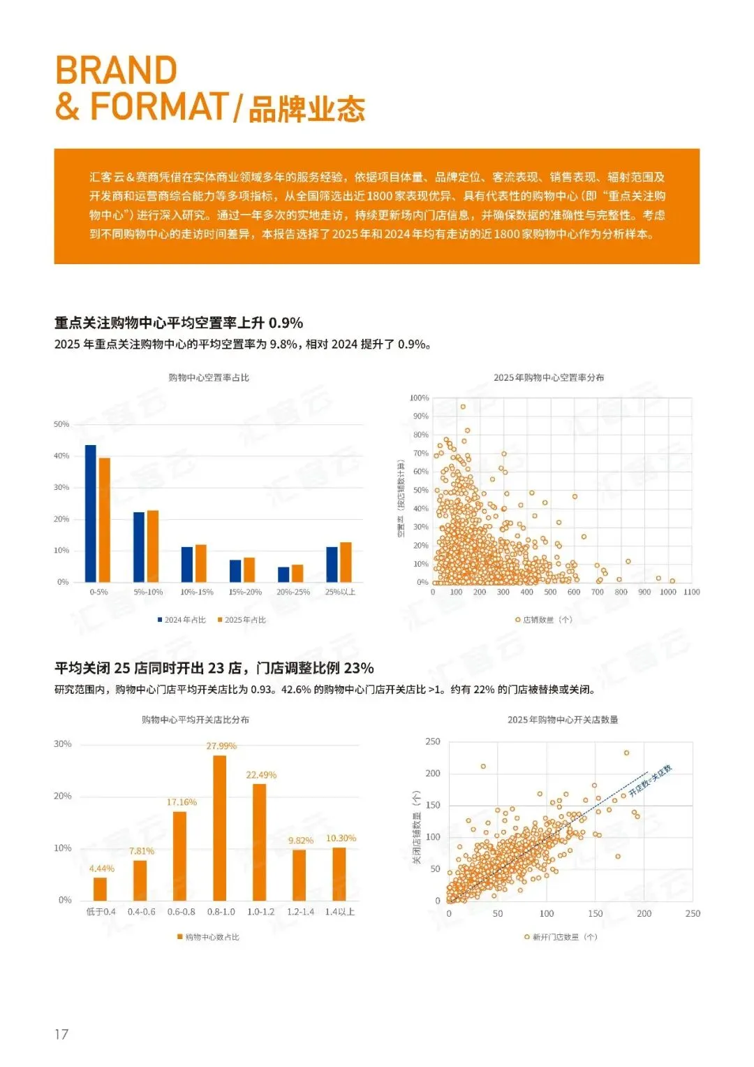 商场里的品牌更迭,正在以更快的速度发生。2025 年,全国重点关注购物中心的平均空置率为 9.8%。研究范围内的购物中心,平均每家全年关闭 25 家门店,同时新开出 23 家门店,整体开关店比为 0.93,只有 42.6% 的购物中心,新开门店数量超过了关闭门店数量,全年约有 22% 的门店被替换或关闭,行业的调整和洗牌,仍在持续进行。