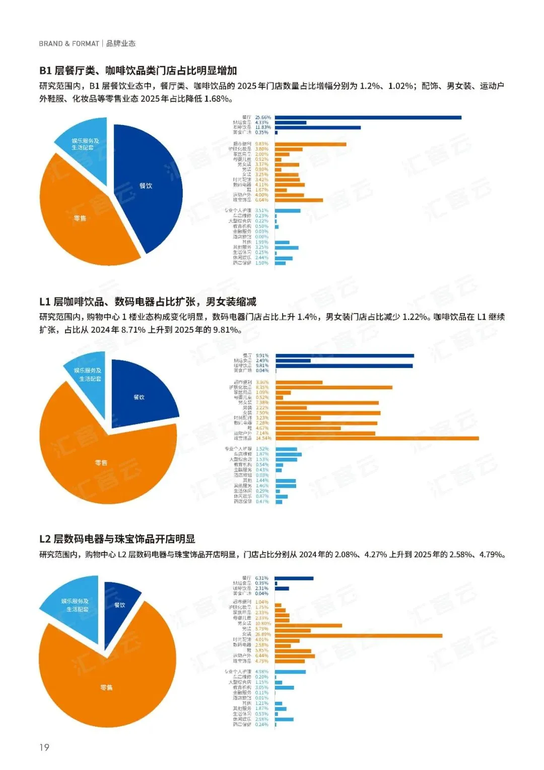 商场的楼层业态布局,也在发生深刻的变化,B1 层的餐厅类和咖啡饮品类门店占比明显增加,各类零售业态占比持续下降,L1 层的咖啡饮品和数码电器门店占比持续扩张,曾经占据绝对主力的男女装业态占比不断缩减,L2 层的数码电器和珠宝饰品品类,新开门店数量也在明显增加,商场的低楼层,不再是服饰品牌的专属阵地,咖啡、数码、餐饮,正在重新定义商场入口的业态格局。