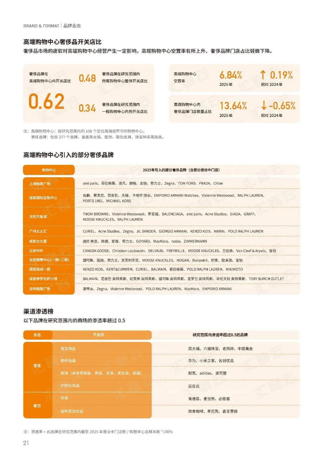 高端消费的流向,正在发生新的变化。2025 年,奢侈品市场的疲软,对高端购物中心的经营产生了直接影响,高端购物中心的空置率较 2024 年上升 0.19 个百分点,达到 6.84%,奢侈品牌在高端购物中心内的开关店比仅为 0.48,门店数量占比也较 2024 年下降了 0.65 个百分点。高端奥特莱斯的客流增长十分明显,2025 年高端奥特莱斯的场均日客流同比增幅达到 4%,周末效应和节假日效应也出现了显著提升,高端消费需求依然存在,只是流向了更具性价比的渠道。
