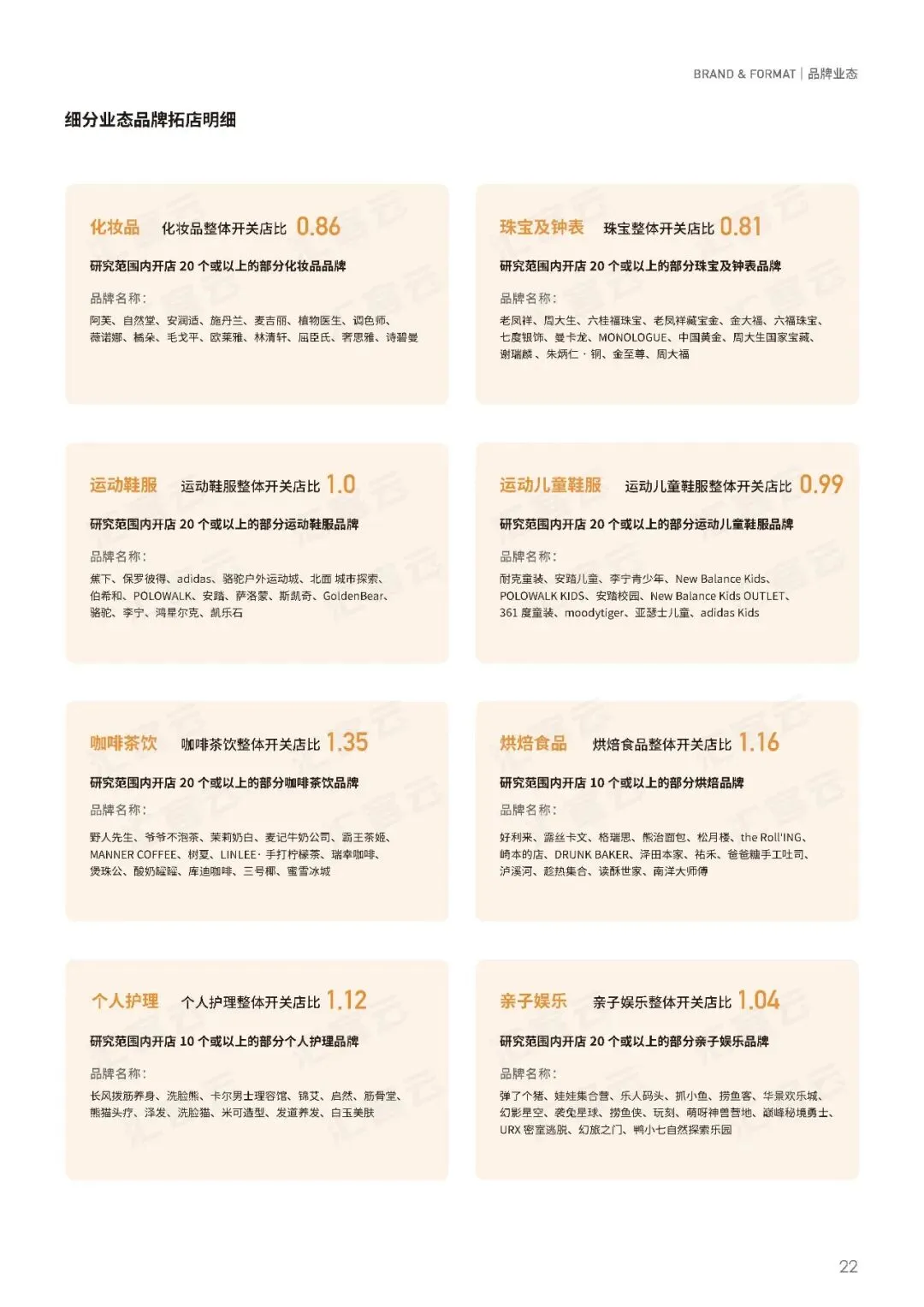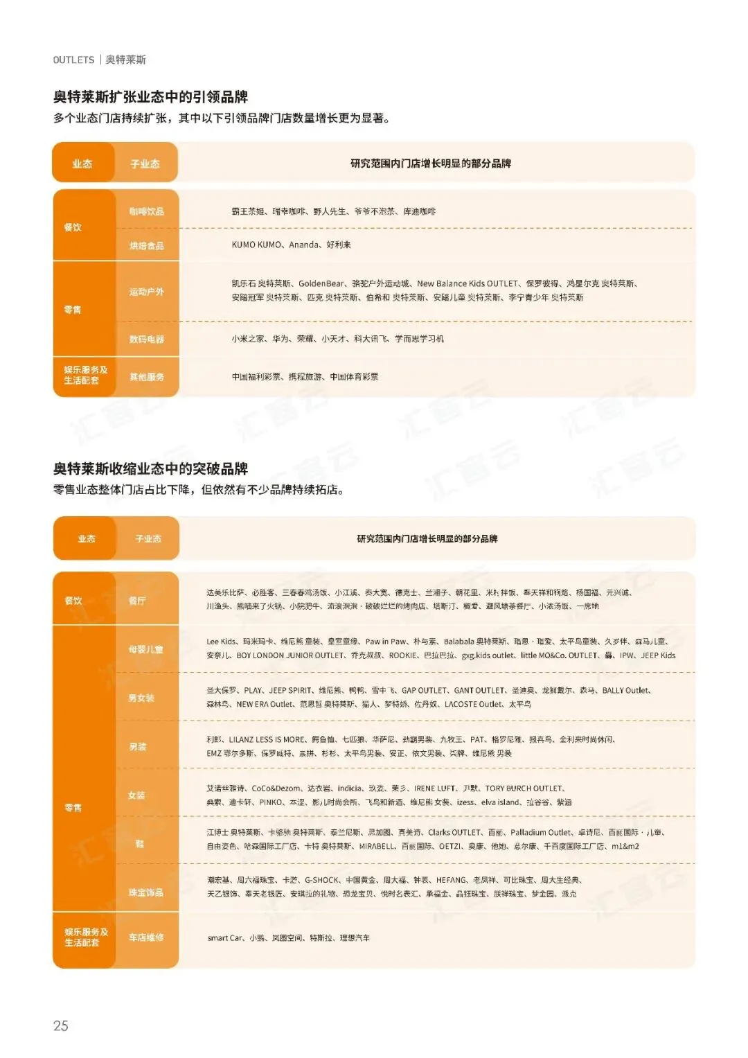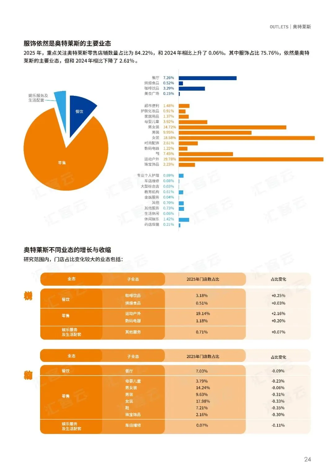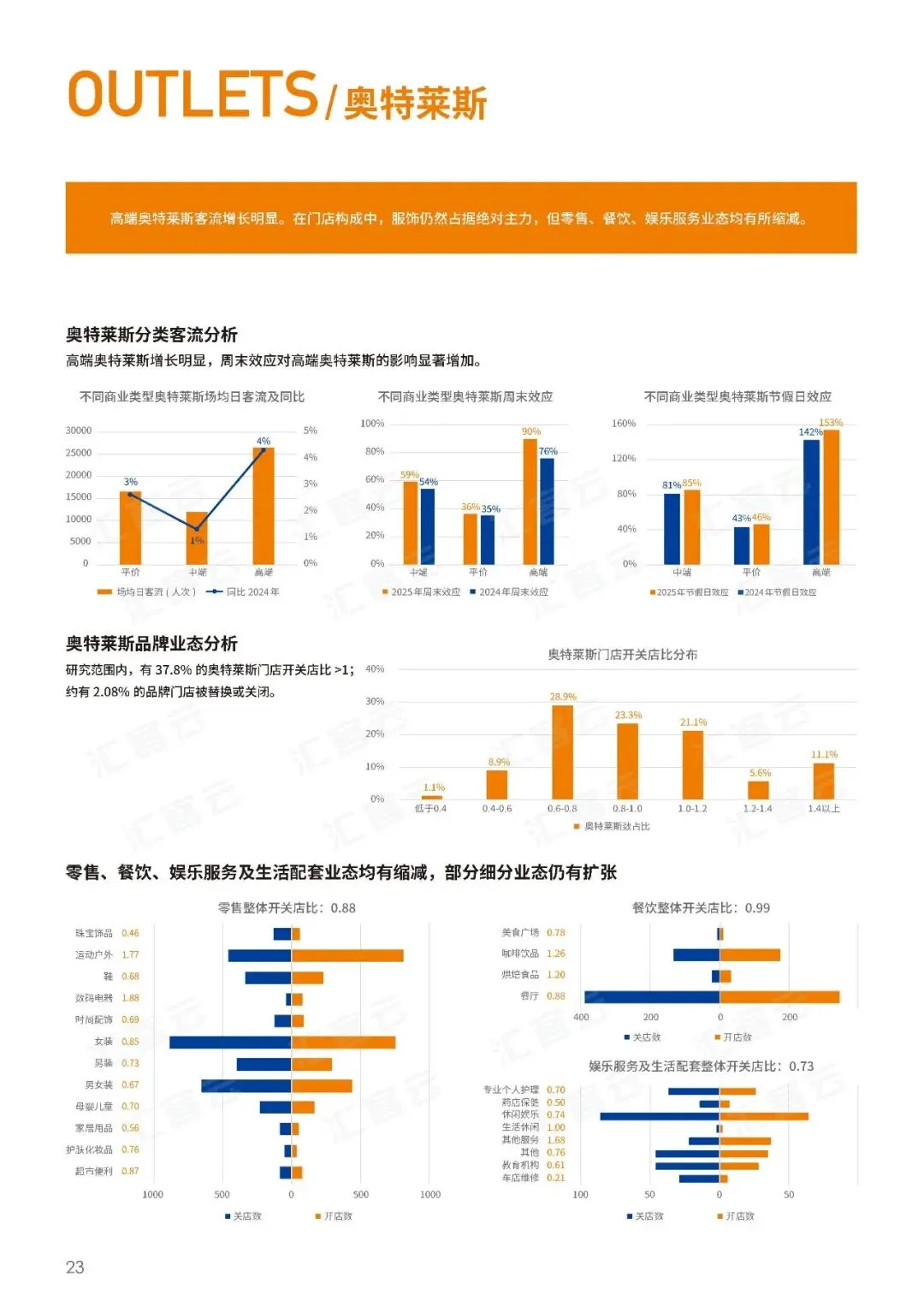 奥特莱斯业态里,服饰依旧是绝对的主力业态,零售店铺数量占比达到 84.22%,其中服饰占比 75.76%,只是较 2024 年有所下降。业态的开关店比方面,奥特莱斯的零售整体开关店比为 0.88,餐饮为 0.99,娱乐服务及生活配套为 0.73,其中运动户外和数码电器品类实现了大幅扩张,咖啡饮品和烘焙食品品类也保持了增长势头,和购物中心的业态变化趋势,形成了呼应。