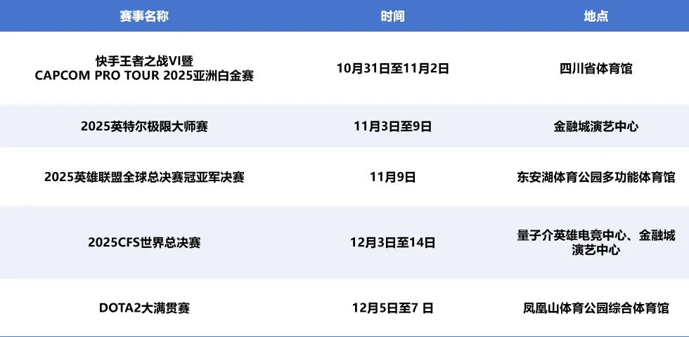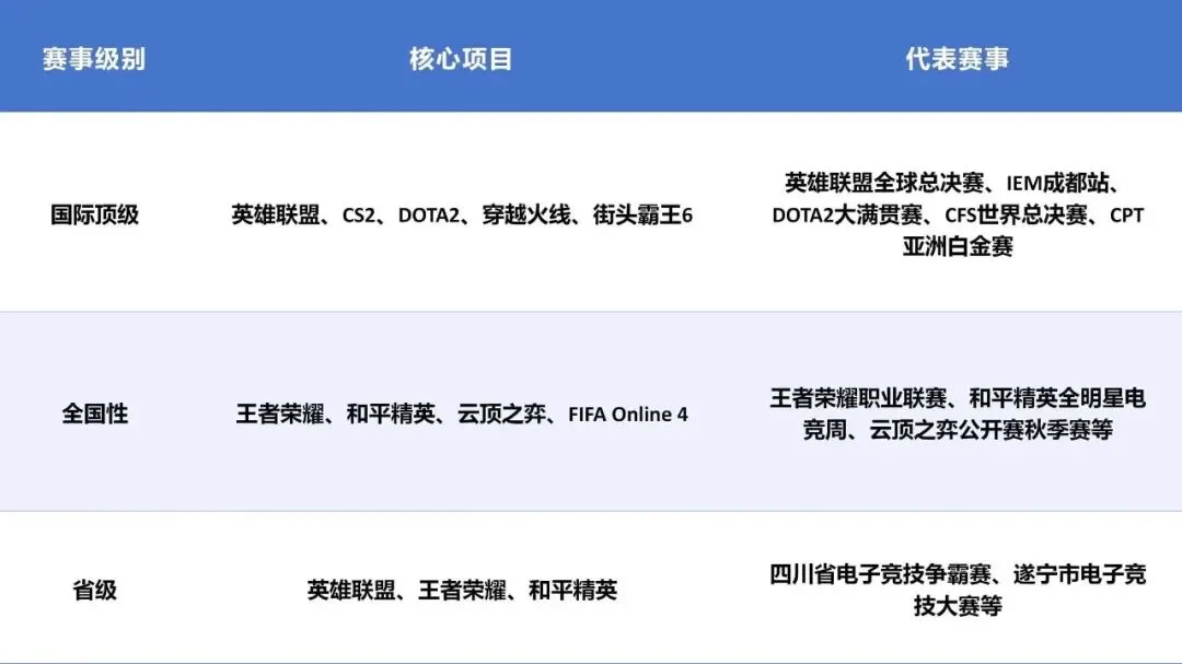 此外,2025年各项电竞赛事中,电竞爱好者的参与程度较高,电竞爱好者们通常以志愿者、兼职的身份参与到电竞赛事或活动当中。同时针对四川省内电子竞技活跃用户的消费习惯进行了调研,结合活跃用户的年龄段及社会身份得出了以下结论:18-24岁学生人群,人均年消费在120-2000元区间,其中游戏充值占比65%,直播打赏占比20%,周边产品占比15%;18-30岁职场人群,人均年消费在3500-5000元,其中设备购置占比达35%,游戏充值占比30%,赛事门票占比15%,电竞酒店占比10%,直播打赏占比10%;30岁以上用户,年消费在800-1500元,其中游戏充值占比40%,电竞酒店占比30%,周边产品20%,赛事观赛10%。截至2025年12月31日,四川省内共有13所大专院校开设了电子竞技运动相关专业,11所正常开班,5所中职院校开设了电子竞技方向,5所技工类学校开设电子竞技专业。学科教育均聚焦于电竞赛事运营、赛事直转播、俱乐部管理、内容创作等复合型人才培养。2025年,四川省举办各类电竞赛事超200场,较2024年的办赛数量有大幅增长,其中国际级5场、全国级16场,地区性赛事超过百余场,线下赛事数量居全国第二。2025成都市“五大赛事”及“黄金赛事90天”如下:四川省拥有多家职业电竞俱乐部,覆盖了《王者荣耀》《和平精英》《决胜巅峰》《第五人格》《穿越火线》《永劫无间》《三角洲行动》《无畏契约》多个主流电竞和亚运会项目。从早期的AG、OMG,到如今的成都GG、YJN、YBG、ZM(逐梦电竞)等,川籍俱乐部始终活跃在各大顶级联赛中。2026年四川省电子竞技产业发展将迎来全面开花,四川省拥有庞大的年轻人口基数,电竞用户数量持续增长。电竞用户的消费意愿较强,对电竞赛事、游戏周边、直播等领域的消费需求日益增长,为电竞行业创造了巨大的市场潜力。四川省在游戏研发、电竞设备、VR/AR技术应用等方面具有潜力,未来电竞行业将与高新技术更加紧密地结合,推动行业技术革新。