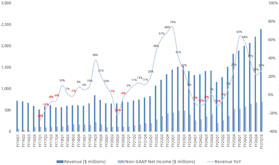 迈威尔FY26Q4财季对应实际时间2025年11/12月-2026年1月。营收22.2亿美元,同比增长22%,环比增长3%,低于市场一致预期的22.6亿美元;预计Q1营收24亿美元,同比增长27%; GAAP毛利率51.7%,同比提升1.2个百分点;NonGAAP毛利率59%,同比下滑1.1个百分点,环比下滑0.7个百分点;预计FY27Q1 NonGAAP毛利率59.3%,同比下滑0.5个百分点; NonGAAP净利润6.85亿美元,同比增长29%,高于市场一致预期的6.78亿美元;NonGAAP净利润率30.9%;预计FY27Q1 NonGAAP净利润6.98亿美元,同比增长29%,净利润率29.1%; GAAP days in inventory 117天,环比提升26天; 本季度回购2亿美元,分红5080万美元;