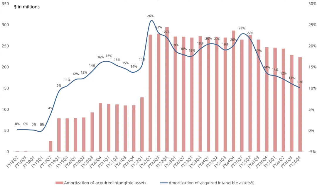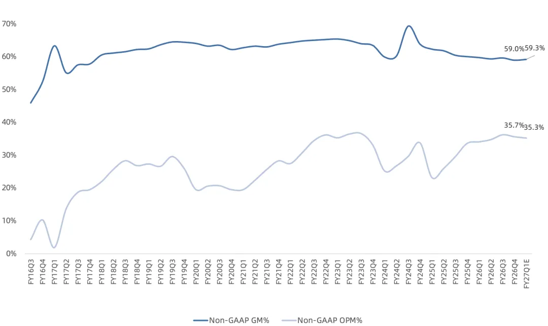 目前根据官方Q4指引,全年营收82亿美元,低于此前预期,NonGAAP净利润25亿美元左右,也略低于26亿美元的预期。按照管理层给的明年指引,FY27全年100多亿美元营收大概对应30多亿美元净利润,目前市值对应大约28倍PE。