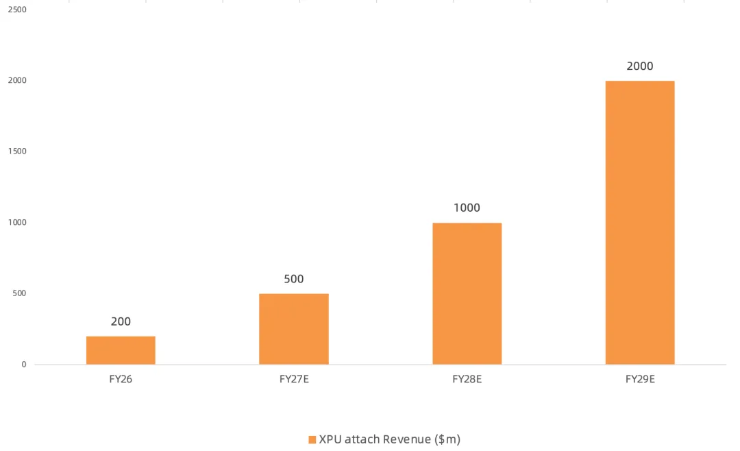 目前公司的ASIC业务主要是定制化XPU(亚马逊Tranium2/3 XPU+谷歌Axion CPU)和XPU Attach产品;尽管深陷AWS Trainium3丢单风波,公司XPU业务仍在FY26收入同比翻倍,预计FY27 XPU收入将同比增长超过20%,FY2028 XPU收入将同比翻倍,主要因新的Tier 1 XPU项目将进入大规模量产、几项XPU attach项目将在FY27开始放量;至于此前市场一直忽视的XPU attach业务,管理层表示CXL的需求正在加快,部分原因是内存供应紧张,定制CXL扩展器可帮助客户将上一代DRAM继续用于新一代XPU/GPU和CPU,同时支持near-memory compute操作;预计XPU attach FY26营收2亿美元左右,FY27营收翻倍至5亿美元,FY28营收翻倍至10亿美元,FY29翻倍至20亿美元,成为公司新的增长点;