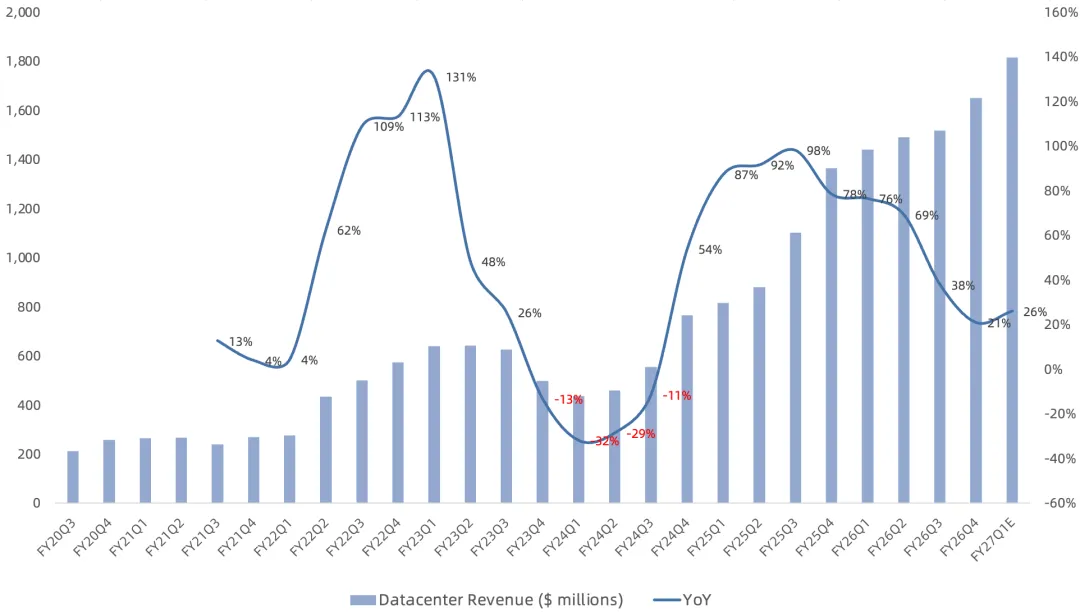 预计FY27营收110亿美元(此前指引是100亿美元),可逐季环比增长,FY27Q4营收超30亿美元;预计FY27数据中心营收同比增长40%(此前指引是25%),互连业务营收同比增长50%(此前指引是30%),ASIC业务营收同比增长20%(不变),主要集中在下半年,通信等其他业务营收同比增长10%;