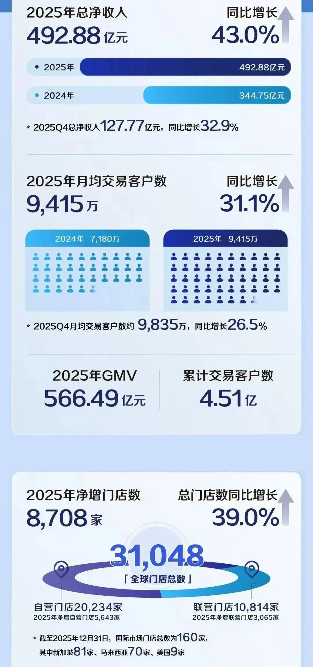 门店扩张方面,瑞幸全年净增门店8708家,其中中国8599家、新加坡30家、马来西亚70家、美国9家,总门店数达31048家,同比增长39.0%,正式迈入“3万门店时代”。