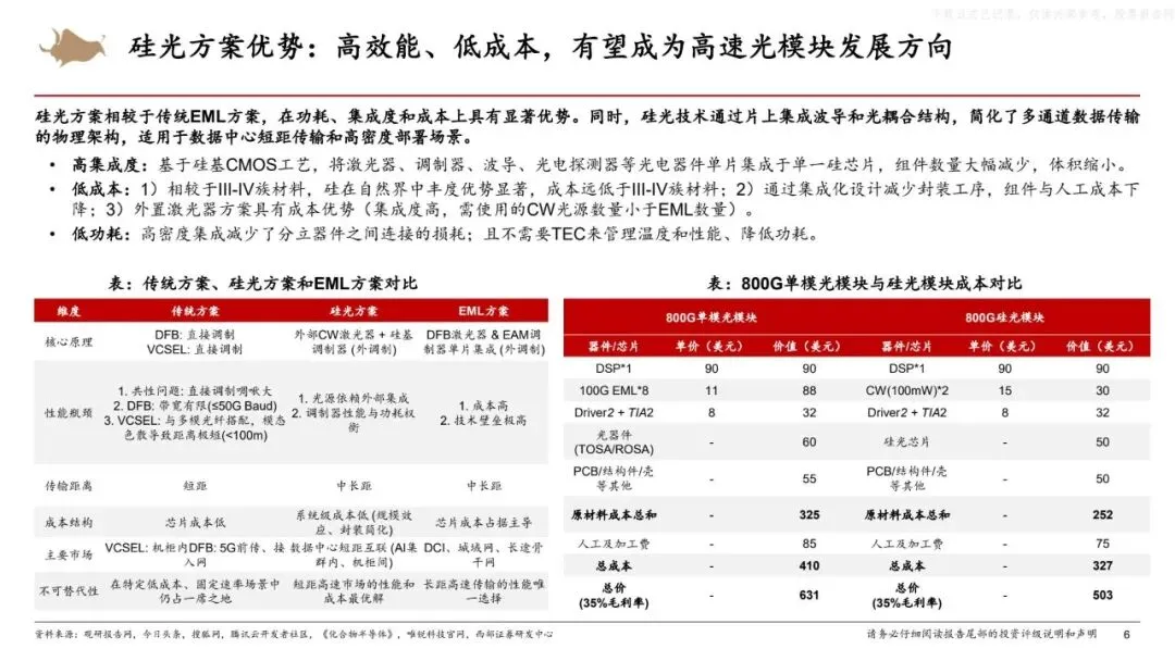 - 低成本:硅材料丰度高,集成设计减少封装工序,800G 硅光模块总成本较单模光模块低 20% 以上(327 美元 vs 410 美元);