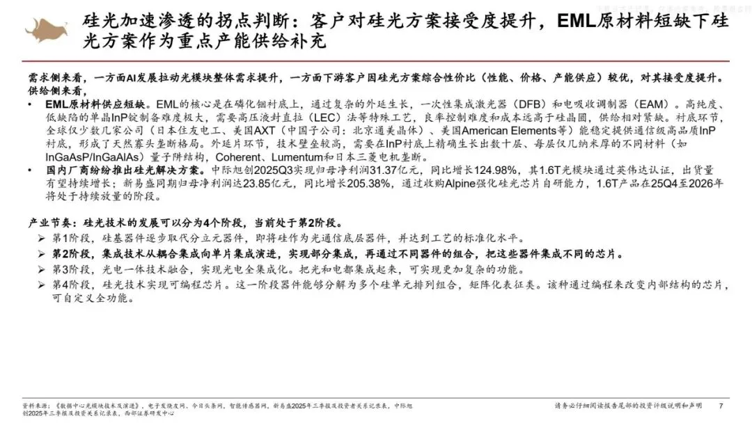 - 供应链补充:避开 EML 方案磷化铟(InP)衬底的供应瓶颈,成为高速光模块主流替代方案。
