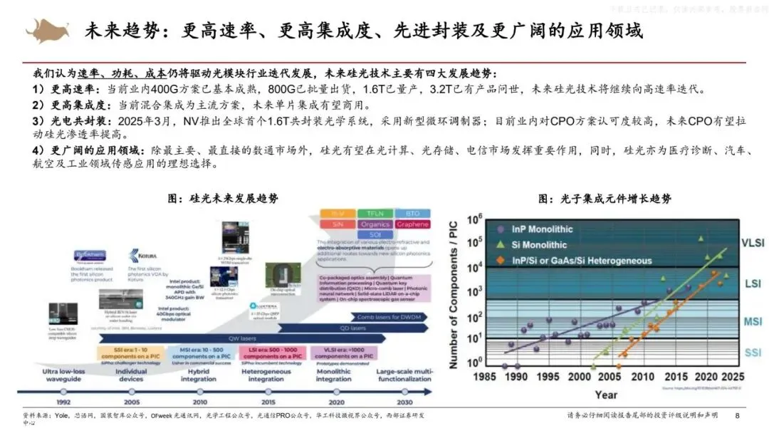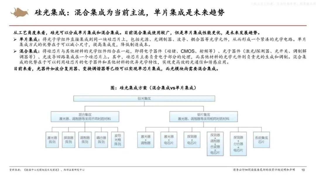 - 更高集成度:混合集成为当前主流,单片集成是未来商用方向;